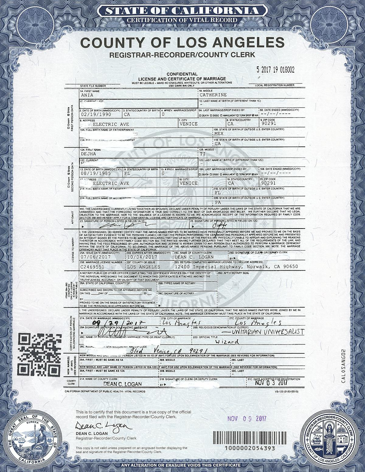 State of California issued vital record (License and Certificate of Marriage), white out, pen, smart contract, time, digital scan, expectation, dynamic NFT, performance art, QR code stamp, black ink
