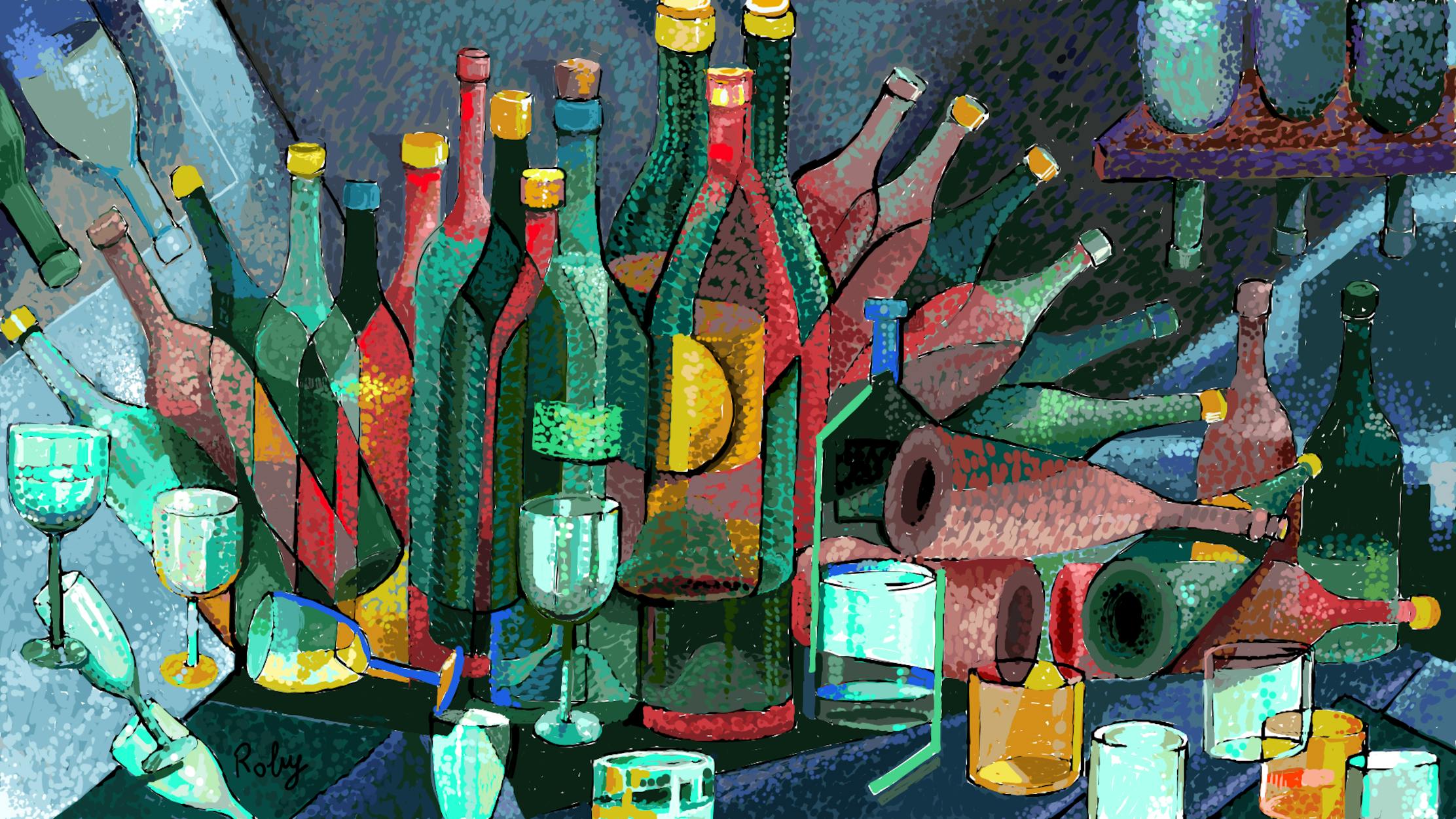 The cubist painter starts from a sensible reality, breaks it down and recomposes it, completely distorting a possible everyday scenario, and reconstructs an imaginary thing relating to balances that, in his opinion, are on an even higher level than reality itself, from an aesthetic point of view. This work is an invention, like all Cubist things, and refers to an imaginary hangover, with a shabby arrangement of bottles and glasses, since after a hangover the left over things are quite out of place. There is a fan-like arrangement of glasses and bottles which makes one imagine the drinker’s mental balance. At a certain point he may fall under the table and this scene is represented by the bottles which are up and overturned. From a technical point of view, in this work there's a search for tension, which appears through strong lights and shadows, as well as colour contrasts. Links present in the sensory environment are broken and others that are in the artist's mind are reconstructed.