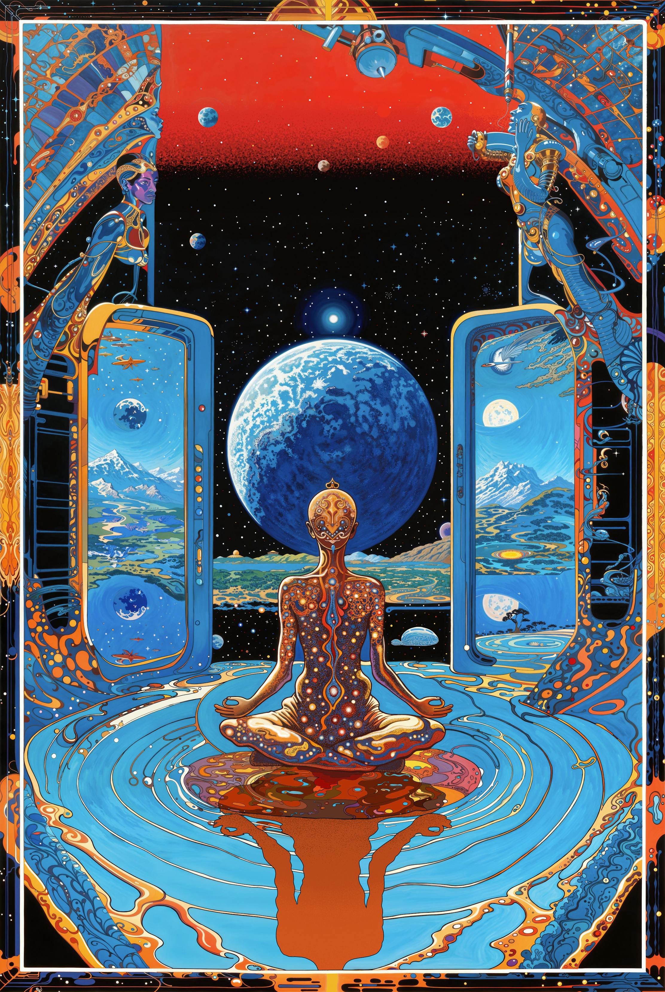 Meditation and introspection have ignited a new fire within me. My latest series, "Way of Bodhisattva," draws inspiration from Shantideva's wisdom and sci-fi landscapes, blending Moebius' ethereal style with Kilian Eng's cosmic surrealism.
