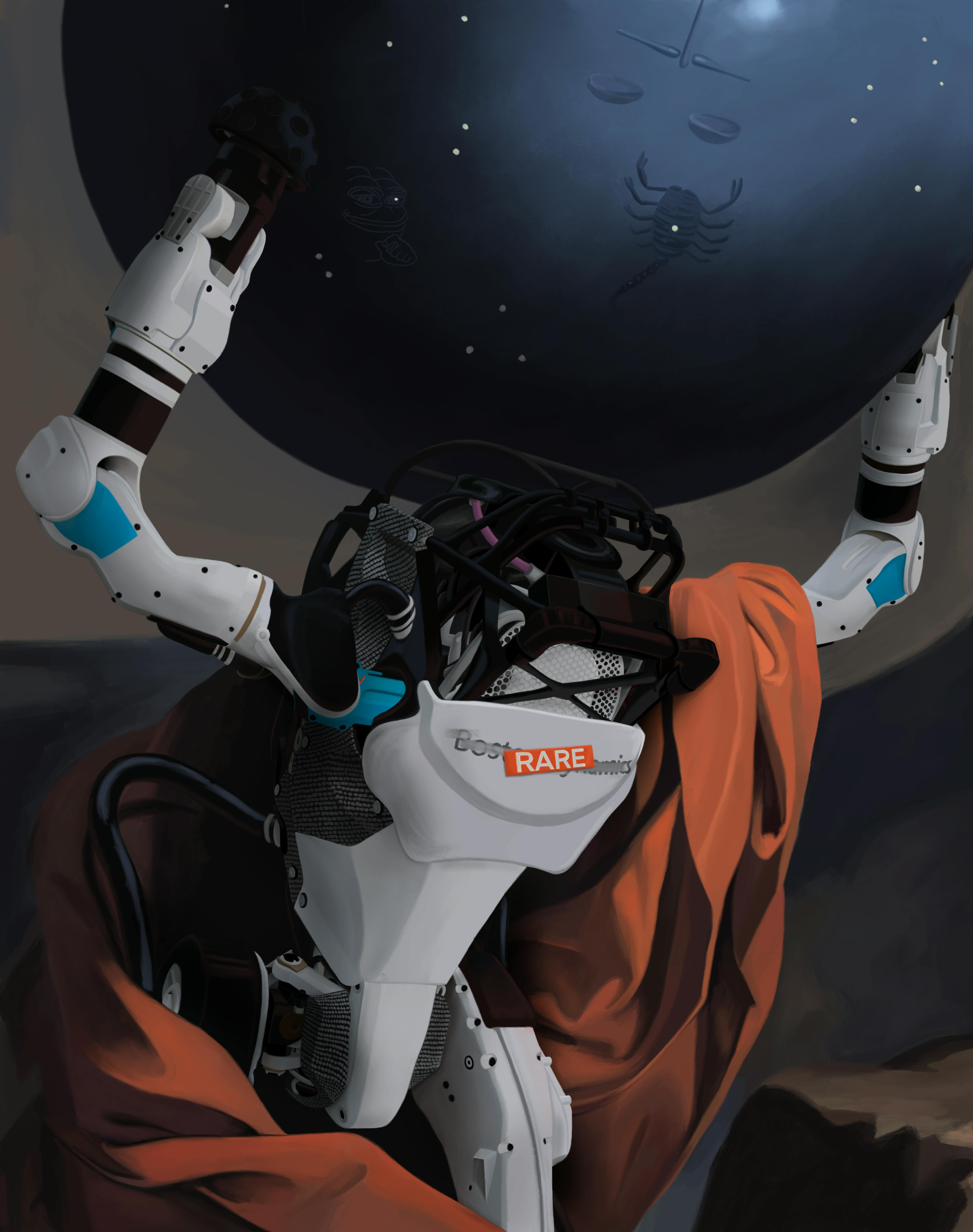 A pastiche of Philip Alexius de László's early 20th century painting, 'The Honourable Edith Helen Chaplin, Marchioness of Londonderry, DBE, with Her Favourite Greyhound, Fly'. Digitally painted including our favorite four legged quadruped robot in place of the hound.
