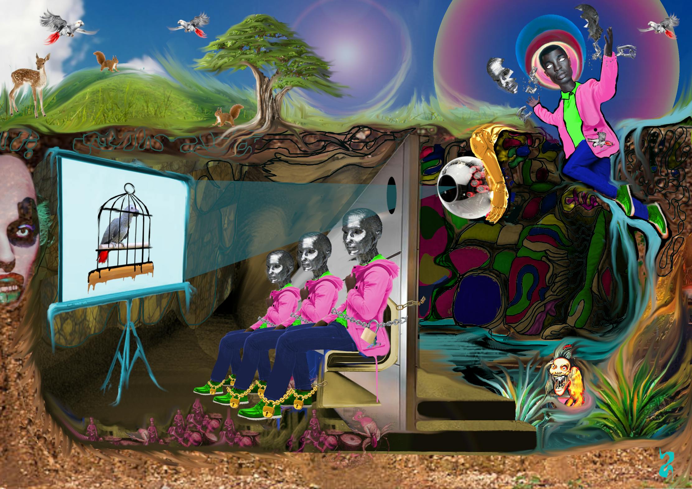 This is a modernized version of the allegory Plato’s Cave which describes a group of prisoners who live chained to a wall in a cave, facing a screen that has a caged parrot projected on it. The people watch the images of caged parrots and begin to believe that birds are naturally found in cages. The caged birds are real to the prisoners, but are not accurate representations of birds in the real world. The screen represents the bit of reality that we can normally perceive through our senses, while the man who escapes from the cave represents the brave souls who forge their own path to find the true nature of things.