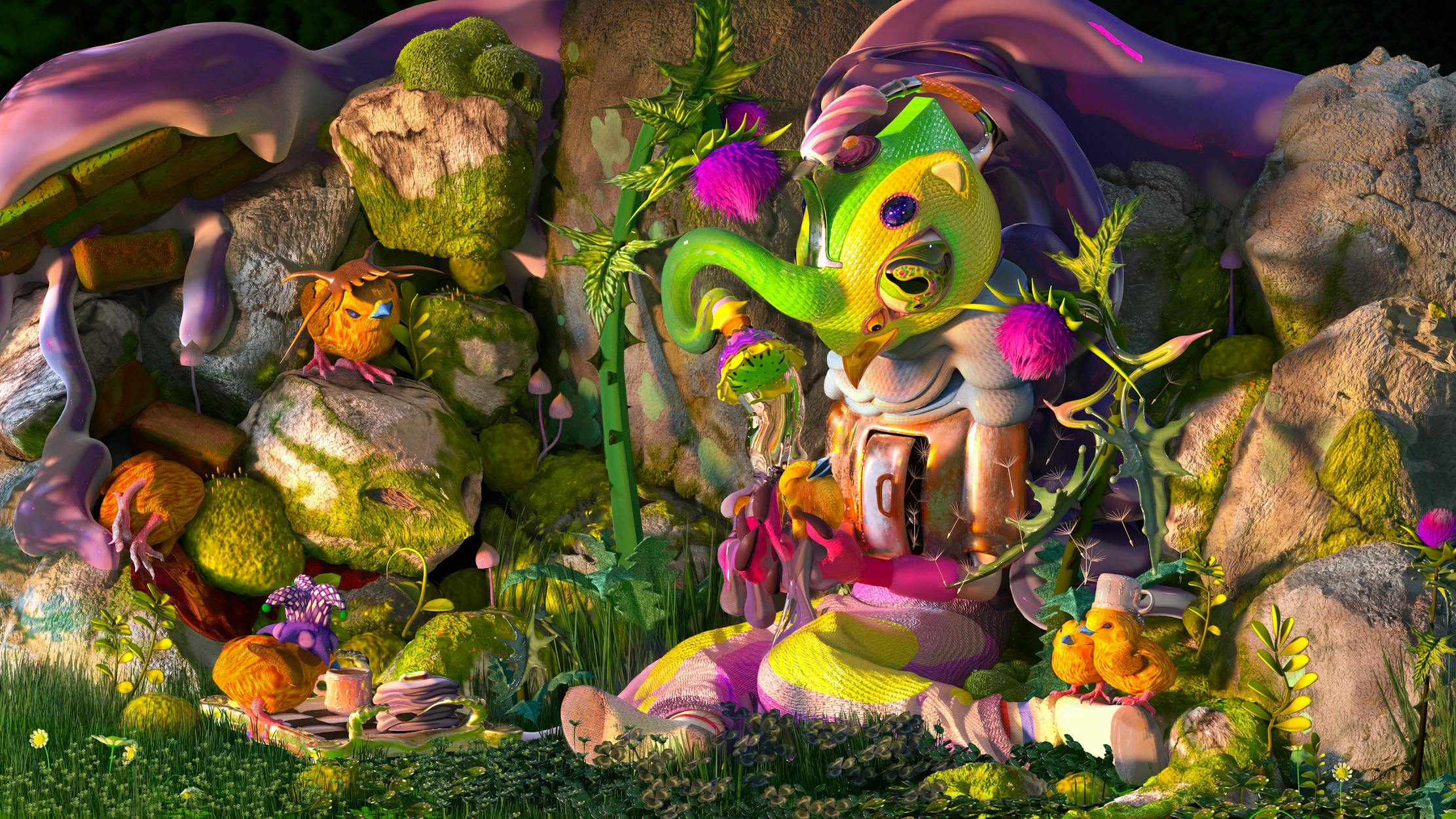 In this piece “Nest” is referring to a human in a state in which they are prioritizing growth. Nest in this piece means a happy home, learning, reflection, family, and curiosity. “Baskets” is being used like the common saying “don’t put all of your eggs in one basket!” In the title Baskets is a monetarily fueled human with a rigid schedule suffering from ego mania, networking cycles, and more often than not alcoholism or drug addiction. The rockery and sludge in the piece represent the boxes people put themselves in when depriving themselves of curiosity and time to grow without monetary intention. I think I wanted to explore this theme because I don't have much family and I find myself missing the family I do have, and the friends I’ve lost, relationships I could have been more present in. Knowing I could have spent more time with them if I was less focused on my work. In short, I dont give a damn about baskets, eggs, assets, connections, brands. At the end of my life I want to look back on a happy nest, I want to make my art in a healthy way, and to connect with people that want that too. A bit more context about why I feel so strongly about this: I am feeling a lot of déjà vu lately. I grew up with one side of my family composed of big tech, lawyers, religion, Harvard grads venture capitalists and alcoholics. The other side are more salt of the earth type, nurses, warehouse workers and gardeners. You can imagine how confusing this was as a child, and which gatherings were more fun. As a child observing all of them I noticed that the people that had more money were all vile and miserable people. But oh boy– they could put on a nice front. I noticed they used money as a filler for a lot of things and when this happens I believe a resentment piles up inside, for the time they've lost, and the ability to make real connections is lost. 🐣🟣🐣🟡🐣🟢🐣 Digital sculpture, Completed June 2023