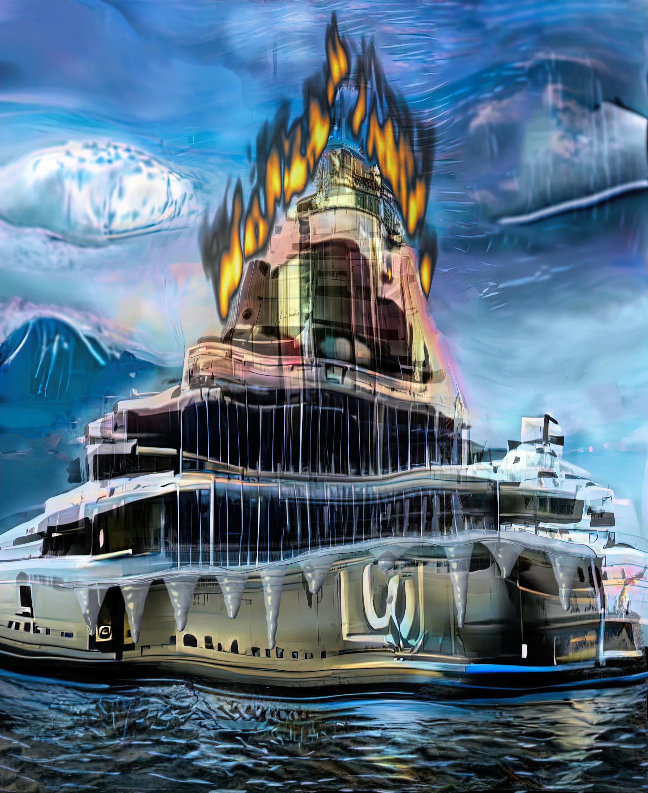 A giant post-armageddon yacht drifts endlessly on the flooded planet, battling both fires and ice. AI image creation generated with help from a series of GAN and VQCLIP-GAN (text-to-image) sequences.