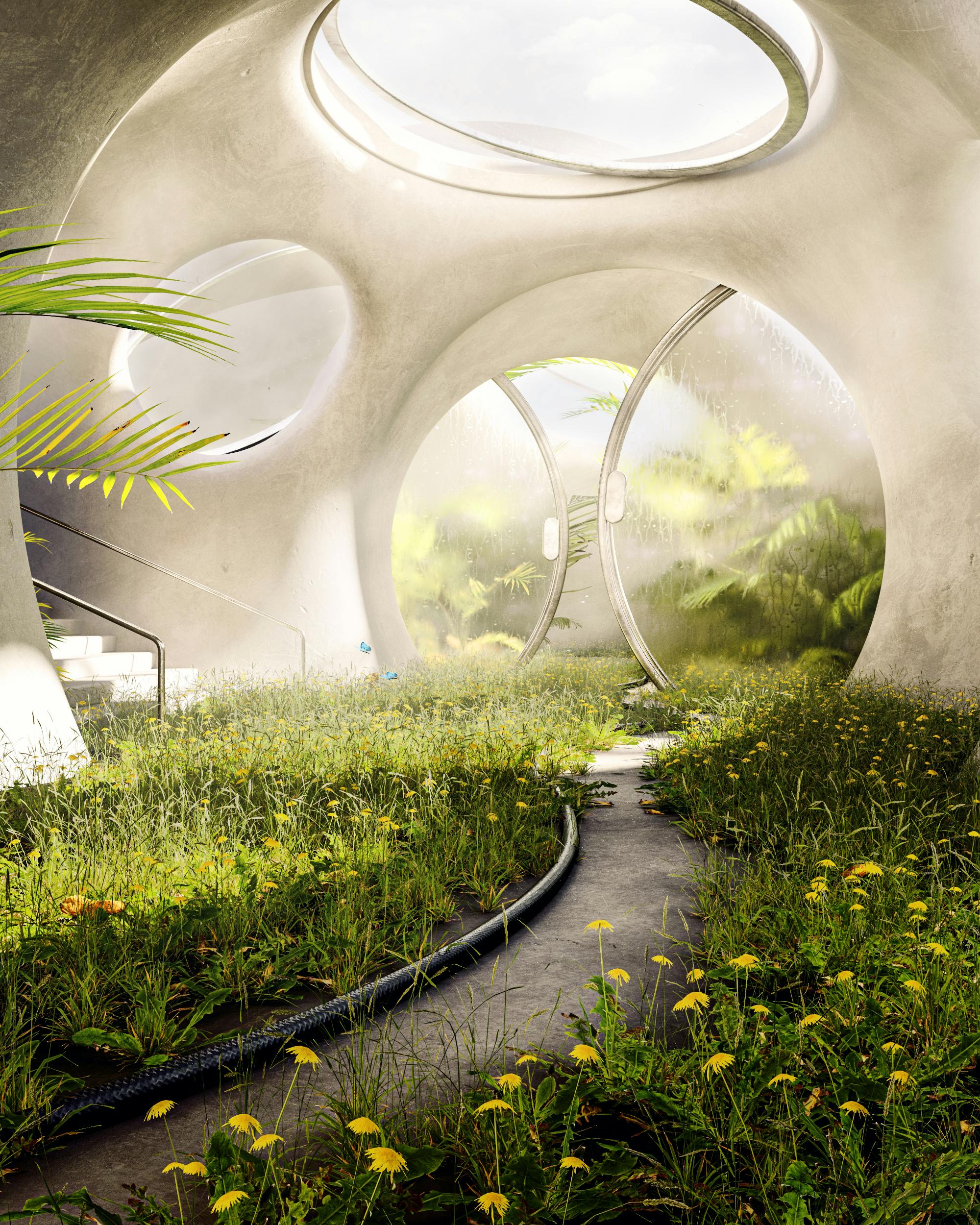 The "BlueBerry House" is a futuristic seaside resort located on an unknown planet. The look of the architecture is made to mix perfectly with the environment around. 4000x5000px / October 2021 © Hugo Fournier