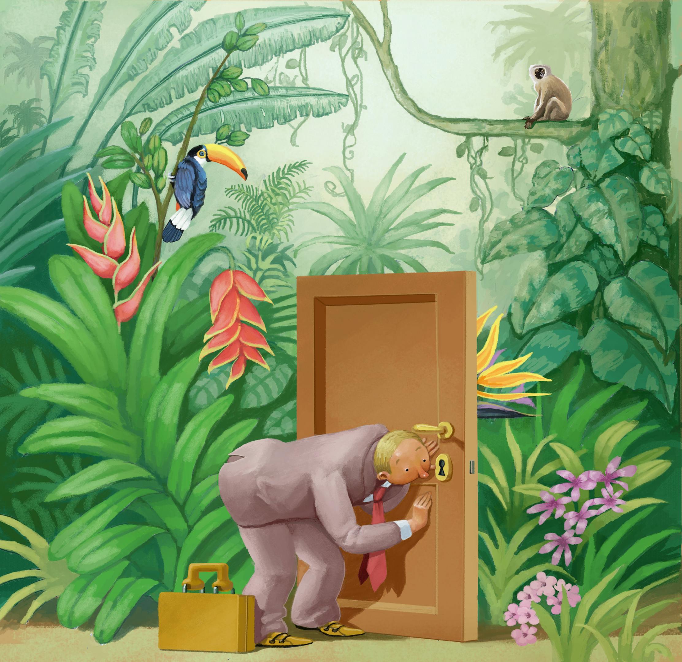 Man immersed in a tropical forest prefers to look into a door lock metaphor of curiosity photoshop digital illustration humorous concept