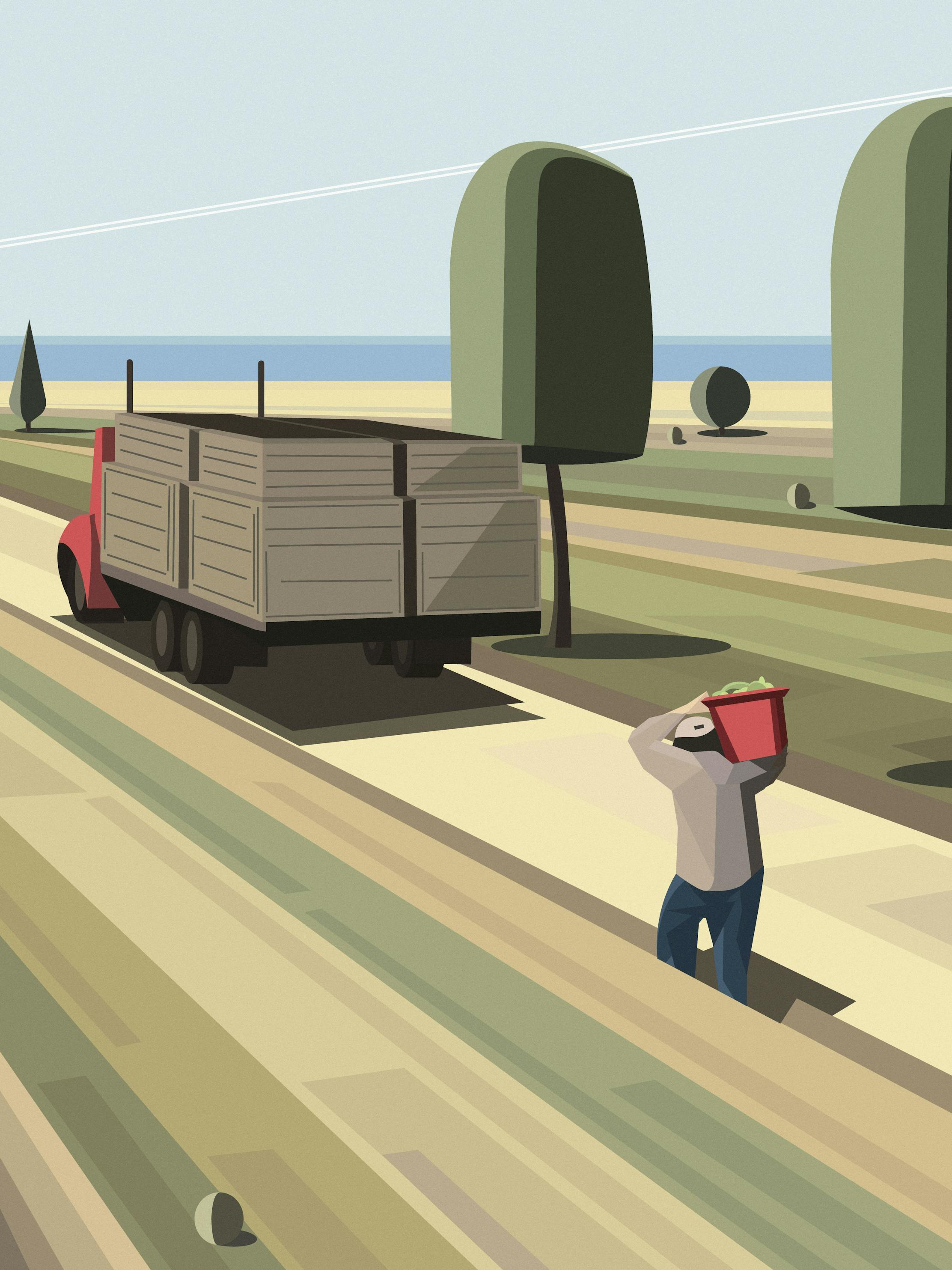 "Fresh Produce" from the "California" series. "California" is a collection of illustrations reimagining life in The Golden State. The fields of overgrown golden grass, the rolling hills, the beaches, the mountains, just about every part of this state has something unique to showcase. Inspired by the vivid imagery of authors including my personal favorite, John Steinbeck, I have created this collection of art to pay homage to the beauty this state has to offer. A romanticism of California. A charming and simple interpretation of the place that helped raise me.