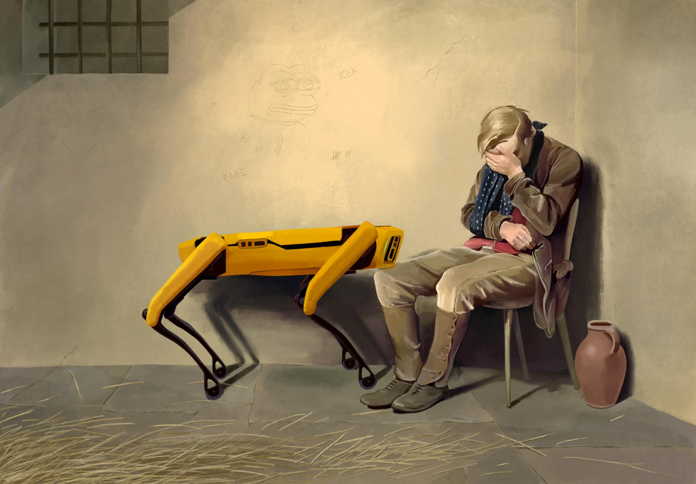 After Briton Rivière's 19th century painting 'Fidelity', recreated from the ground up. Replacing the hound with Boston Dynamic's Spot and the artwork etched upon the wall.
