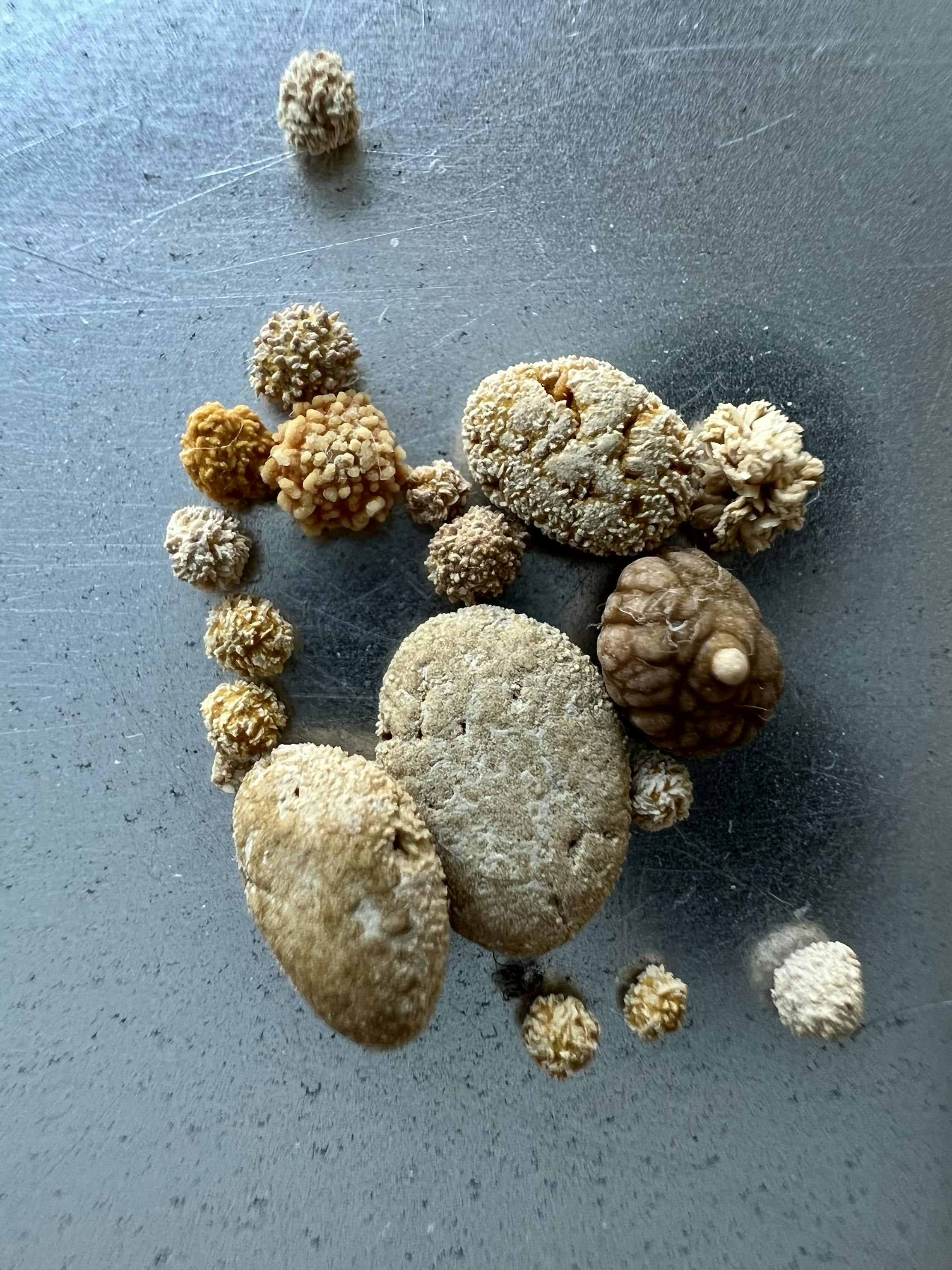 This collection of my kidney stones was produced over a span of about two years. I call it my Inner Beauty Collection, referencing a comment made by one of the twin doctors in my movie Dead Ringers, who wonders why there couldn’t be a beauty contest for the insides of the human body. Well, here’s my nominated candidate. I see in these kidney stones a luminous narrative generated by a group of my inner organs, a narrative as intimate as a person could imagine. I think each stone presents a unique aesthetic of structure, colour, and organic content that engages with the mystery of my essence, my reality, which is my body, inside and out. Not surprisingly, perhaps, the collection also references my new movie, Crimes of the Future, which stars Viggo Mortensen as a performance artist whose art form involves public surgery on his own body, during which strange new organs of unknown function are removed and displayed. Art always has the last word.