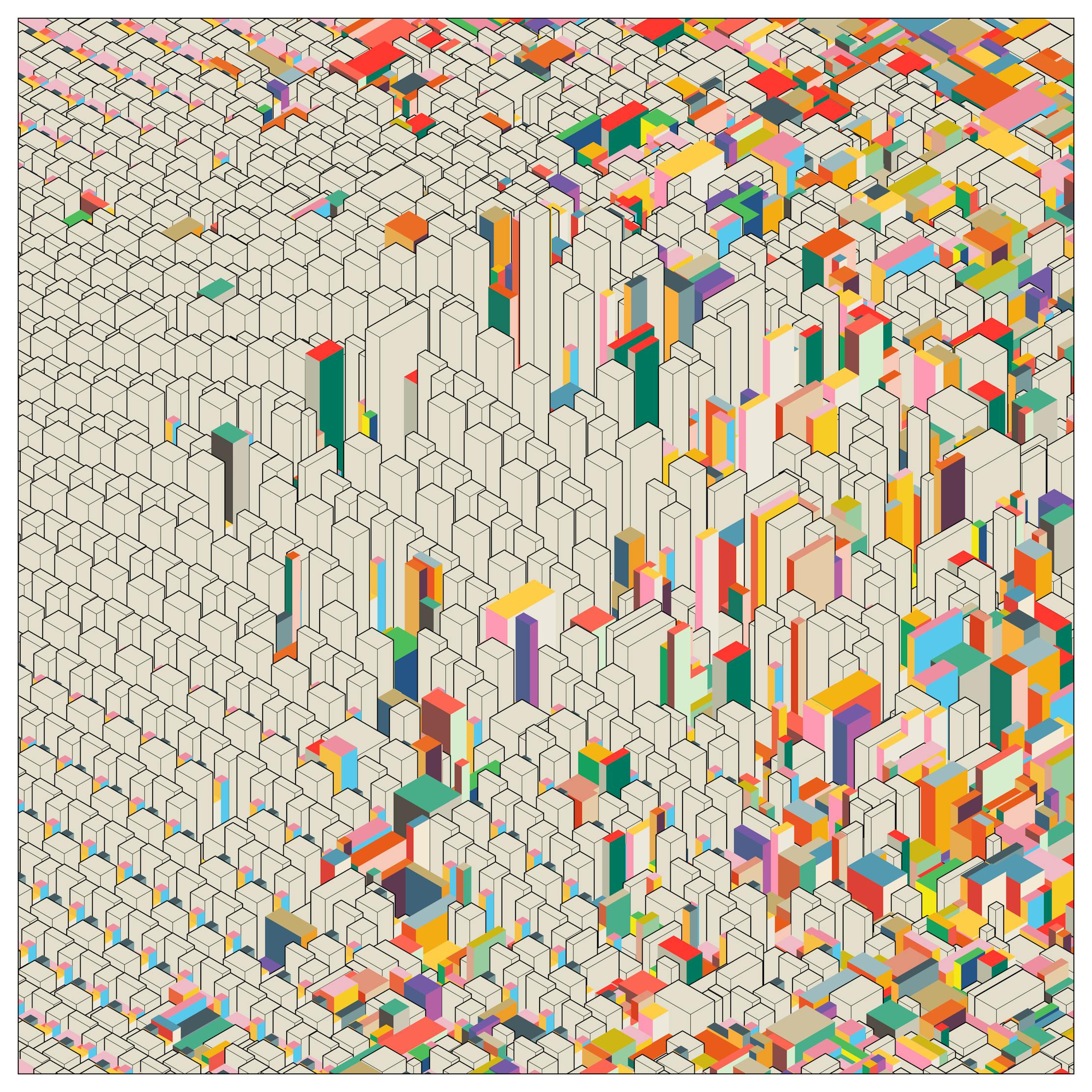 When is something perceived as an orderly system and at what point are we giving up, treating it like chaos? The Iteration series attempts to give nuance to the juxtaposition of structure and disarray. It creates an impression of structure by generating a random layout of blocks and repeating it in two directions. By making the process of repetition imperfect, with a small chance of mutating the initial layout, a feeling of chaos is reintroduced.