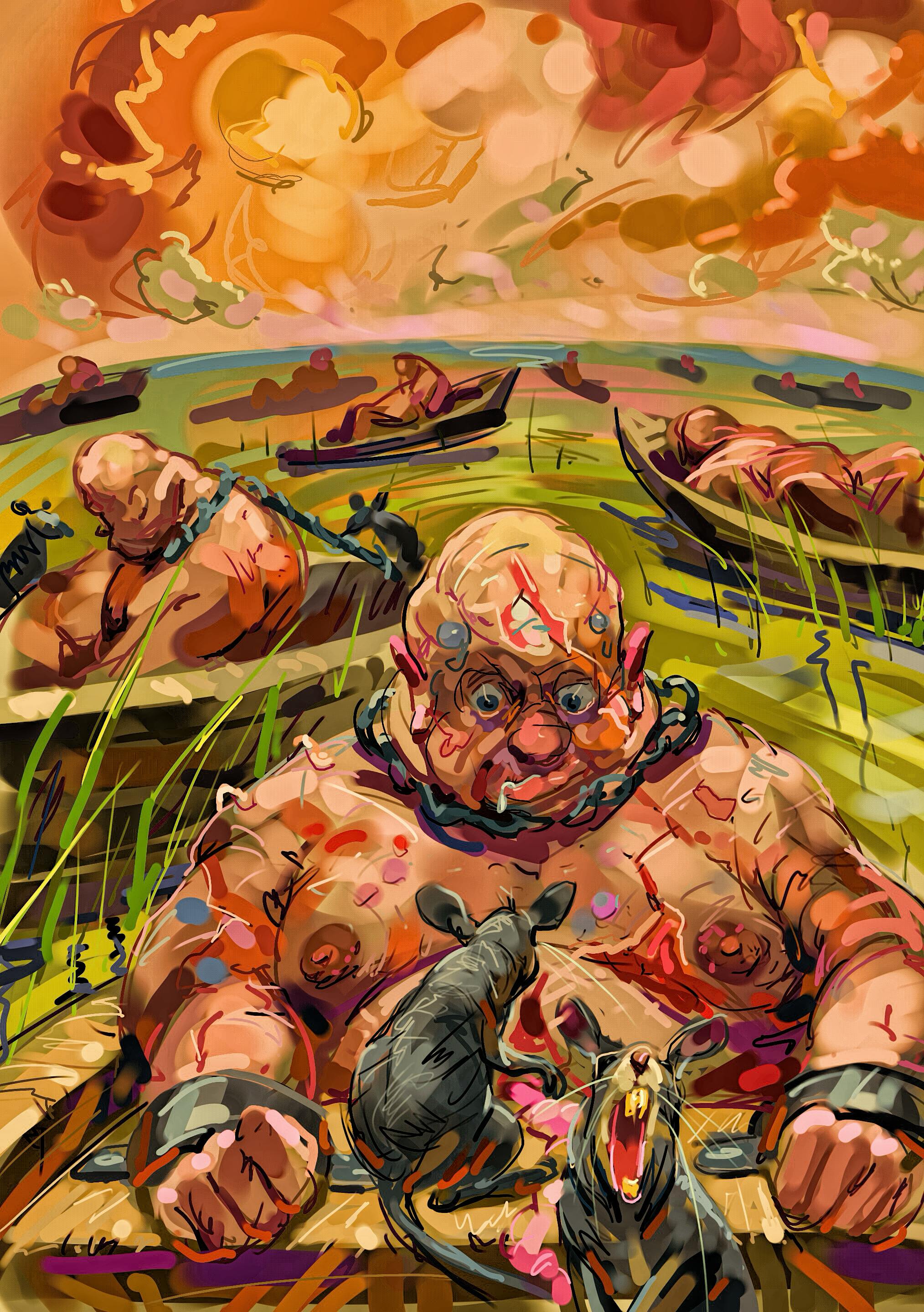 Succumbed to tortured madness, experiencing the agonizing, nightmare crawl of hundreds of insects on their skin, burrowing into their eyes and ears and nose, filling their mouths, while worms and parasites bred in the filth at the bottom of the boat and squirmed up into their bowels. Not too many, but enough rodents with a never ending appetite also live in some of these boats, slowly eating small parts of the inhabitants of all boats, 'travelling' from one boat to another.