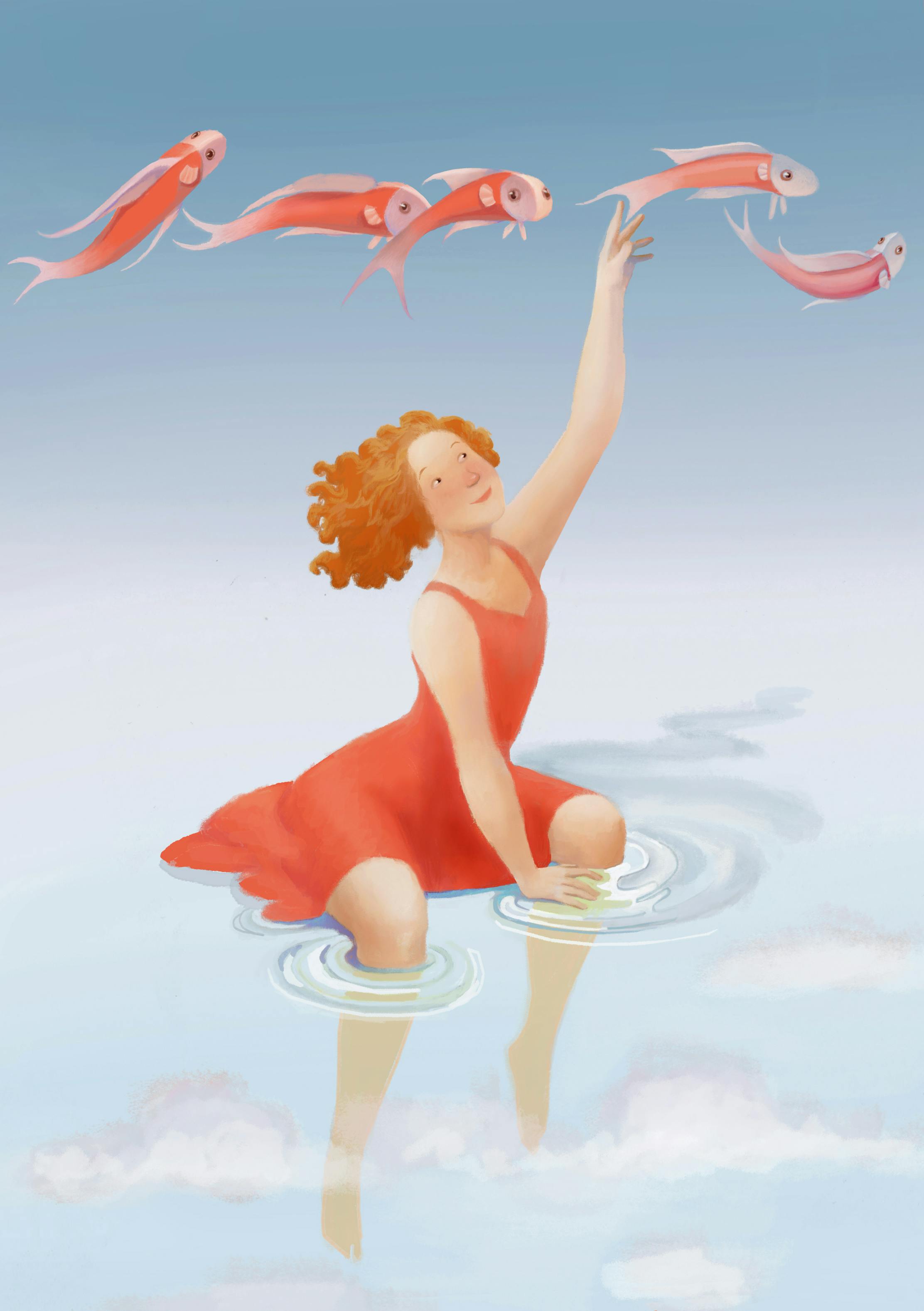 girl sits lightly on the water raises an arm to touch fish floating in the sky photoshop illustration