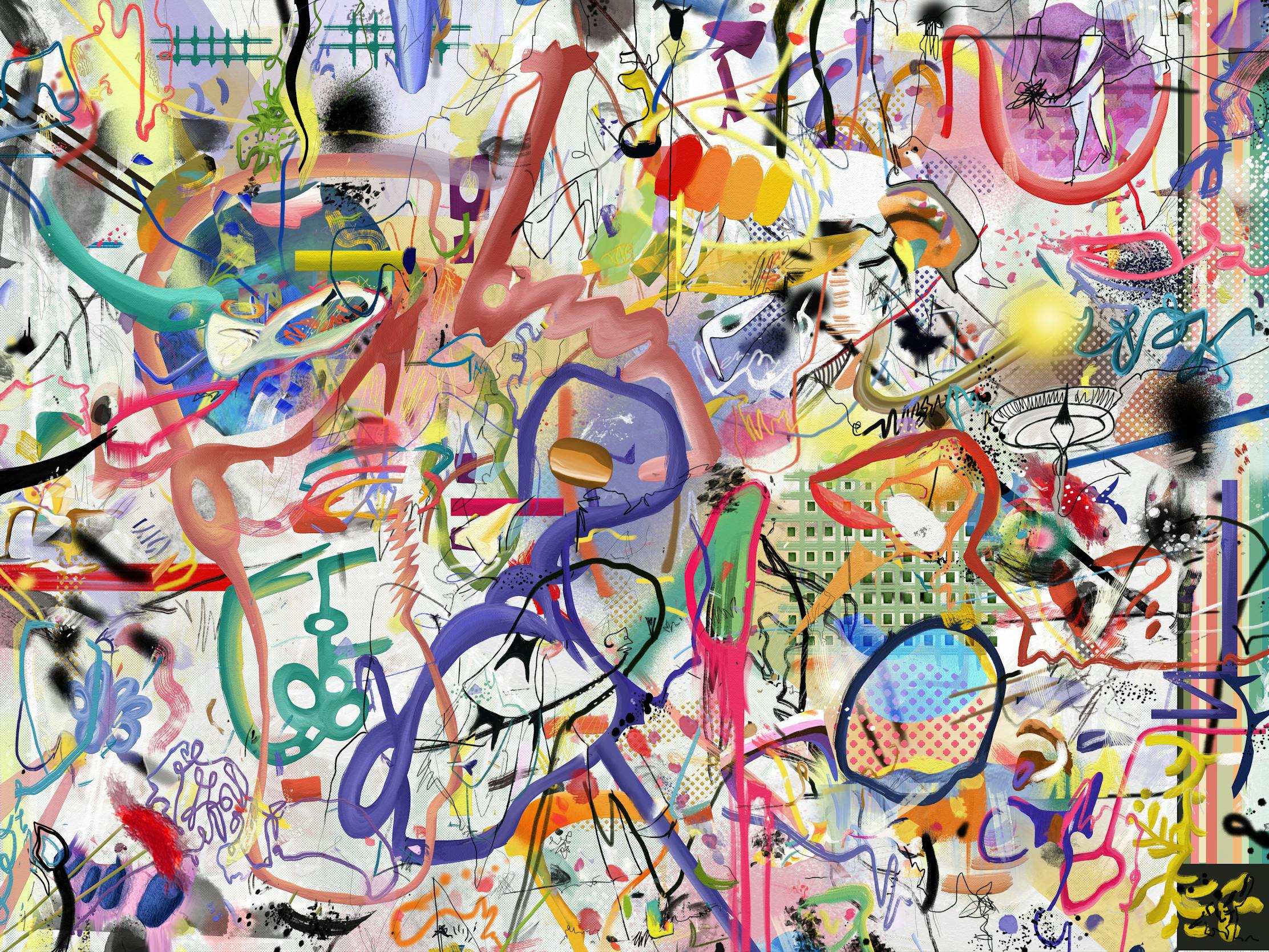 Over the rainbow was made with part of my physical paintings merged with digital art in a Photoshop file. This painting took time to be done, there were a lot of decisions to make until each shape found its own place, its unique color and path. I worked in a large file with almost 100 layers. By changing layer and blending modes my goal was to achieve a sense of depth by changing opacity percentages, creating superpositions and combining several elements, drawing lines and brushstrokes in a unique composition. The result was a very peculiar surrealistic landscape where saturated colors lead us to impossible places.