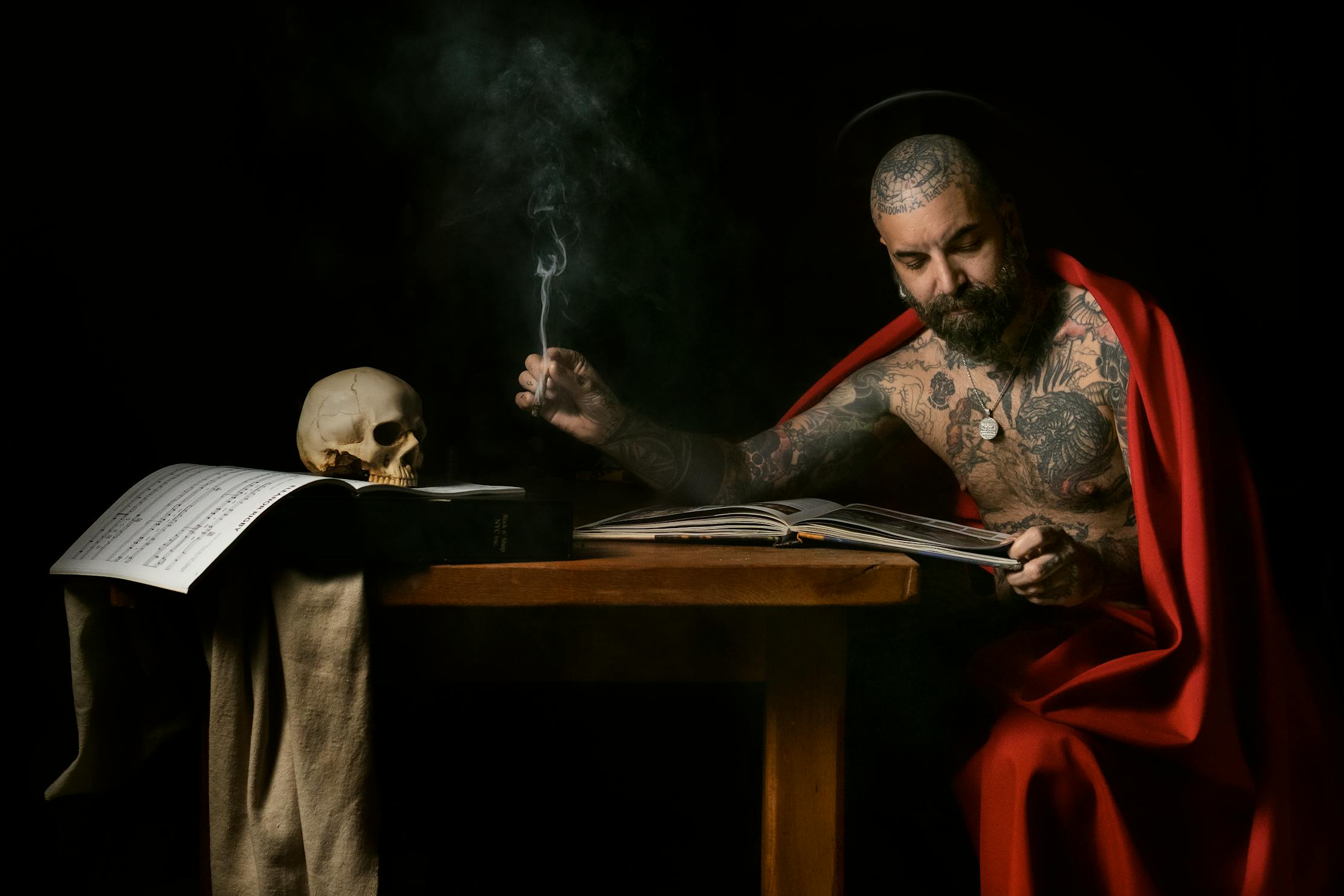Saint Gregory is a reinterpretation of Caravaggio's "Saint Jerome" in a modern context, departing from Jerome's interpreting of the bible and instead displaying the contemplative comforts of our age. Gabriel's work pays respect to classical and chiaroscuro stylings of the past while offering a new vision of fine art photography.