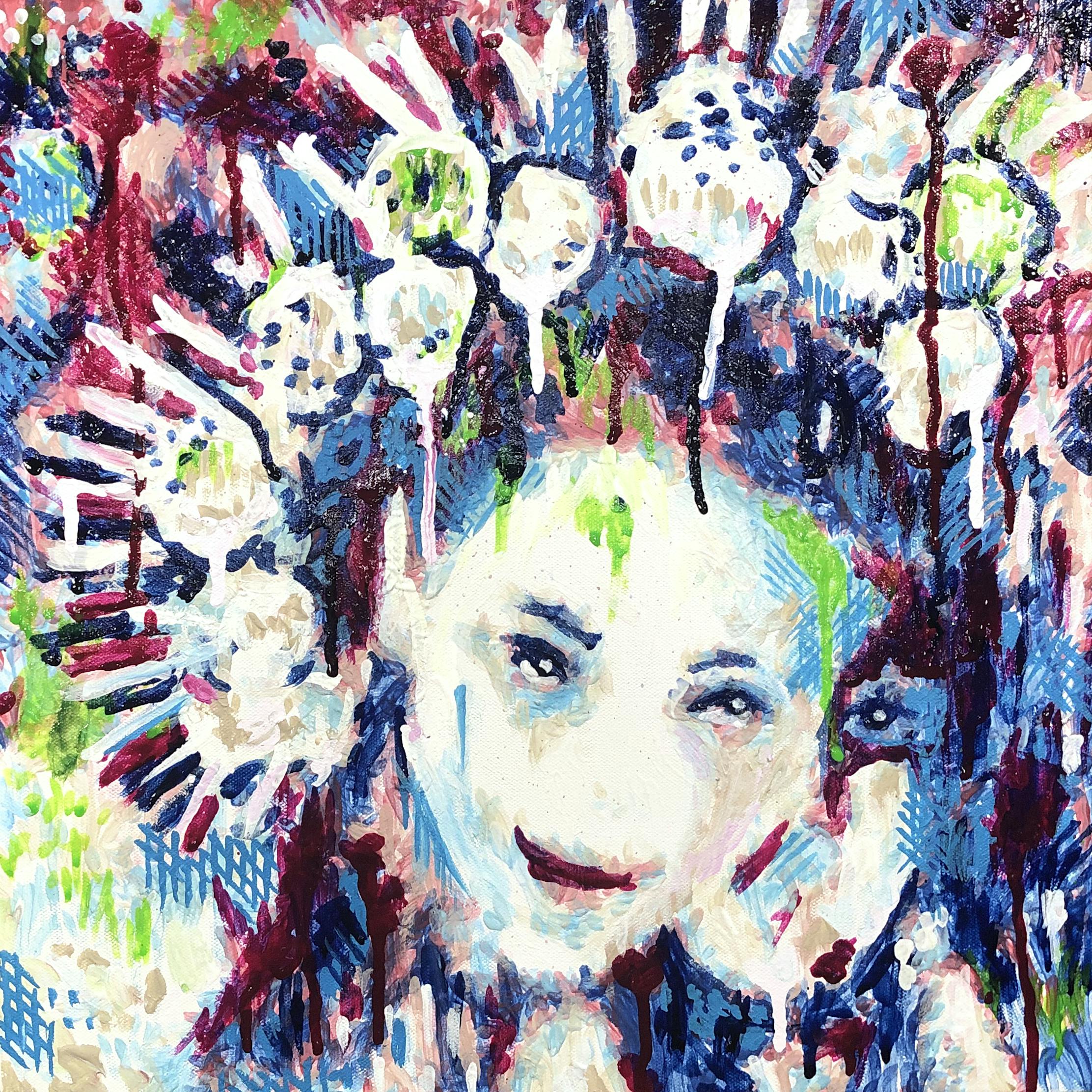 A collaboration with an artificially intelligent creative mind that I have been designing for over fifteen years. This image was painted with a brush on canvas by one of my autonomous painting robots. I did not plan on naming it The Creative Mind, but once the robot was complete I realized that all those bubbles above the face resembled thoughts, and it reminded me of how the robot created. It has multiple independent creative AIs that are all in competition with one another. It thinks like an artist as it paints, considering multiple possibilities and proceeding with its favorite.