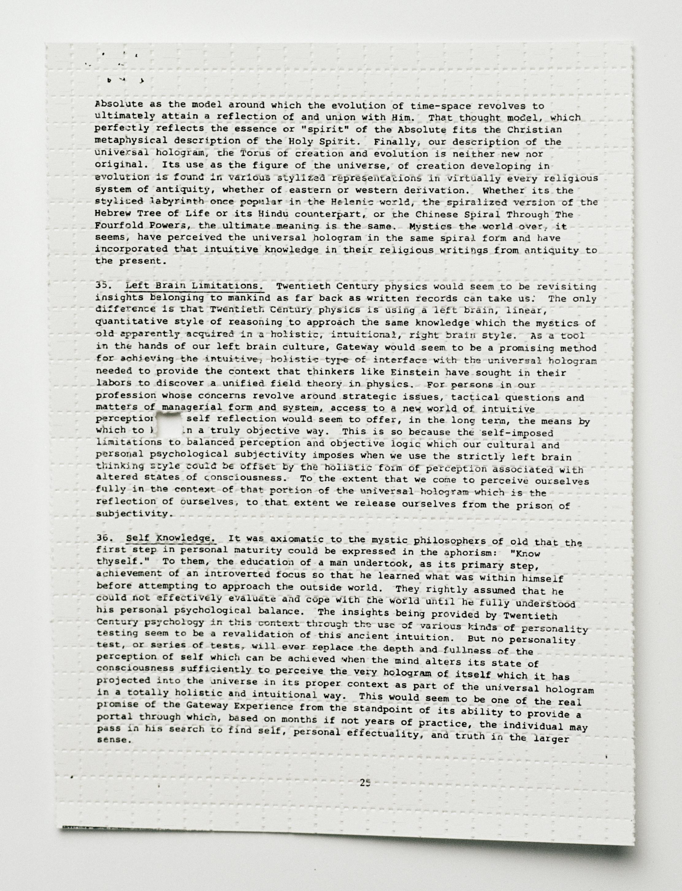 Welcome to the first 4th-Dimensional NFT. Time travel with me: In 1983, the US Government produced a classified report testing the achievability of astral projection. The Gateway Report was declassified in 2003. It was missing a crucial page - I investigated the backstory. Millions of folks read my articles. Tens of thousands of astral travelers from around the world emailed me their experiences. Then one day, the missing page showed up. It contains a vision unifying quantum physics, spirituality and self-understanding. 'The Gateway' is a high-resolution image of the missing page 25. Zoom in to read 658 digitally micro-inscribed astral projection experiences (thanks for the lift SuperRare). ✨ JPG 19513 × 25500 pixels, perforated blotter paper, mixed media.