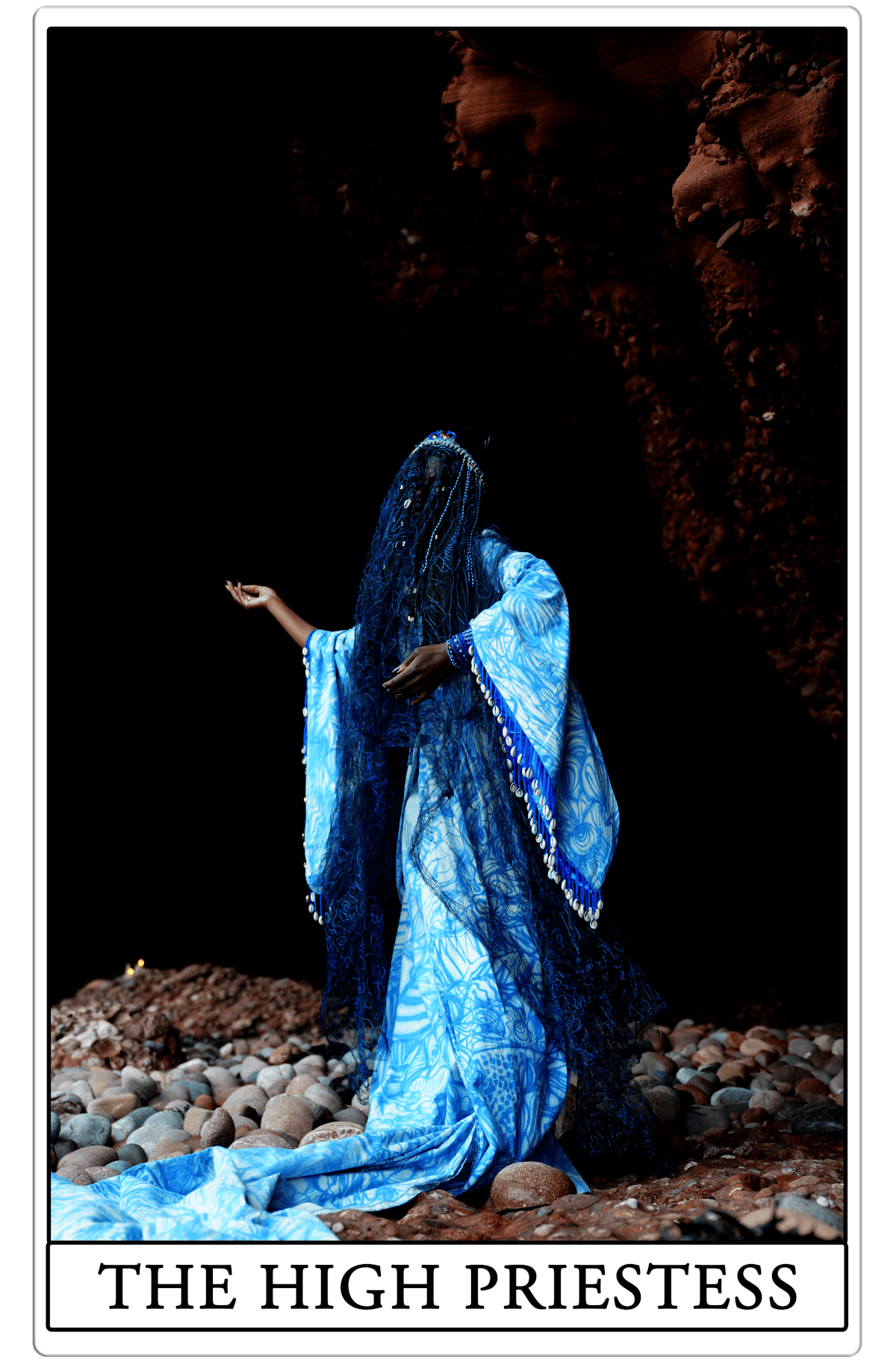 The 2nd Major Arcana card in the Tarot Deck, representing mystery, stillness and reflection, The High Priestess symbolises the time for withdrawal and instinctive self-guidance. In the image, a figure stands illuminated in the dark yawning of a cave, shrouded and still, wearing Blue of the Horizon, a period style dress designed in collaboration with artist and seamstress Fiona Catherine Powell. The figure holds a stance in place that signifies ritualistic movements similar to the gestures in the film Profound Divine Sky.