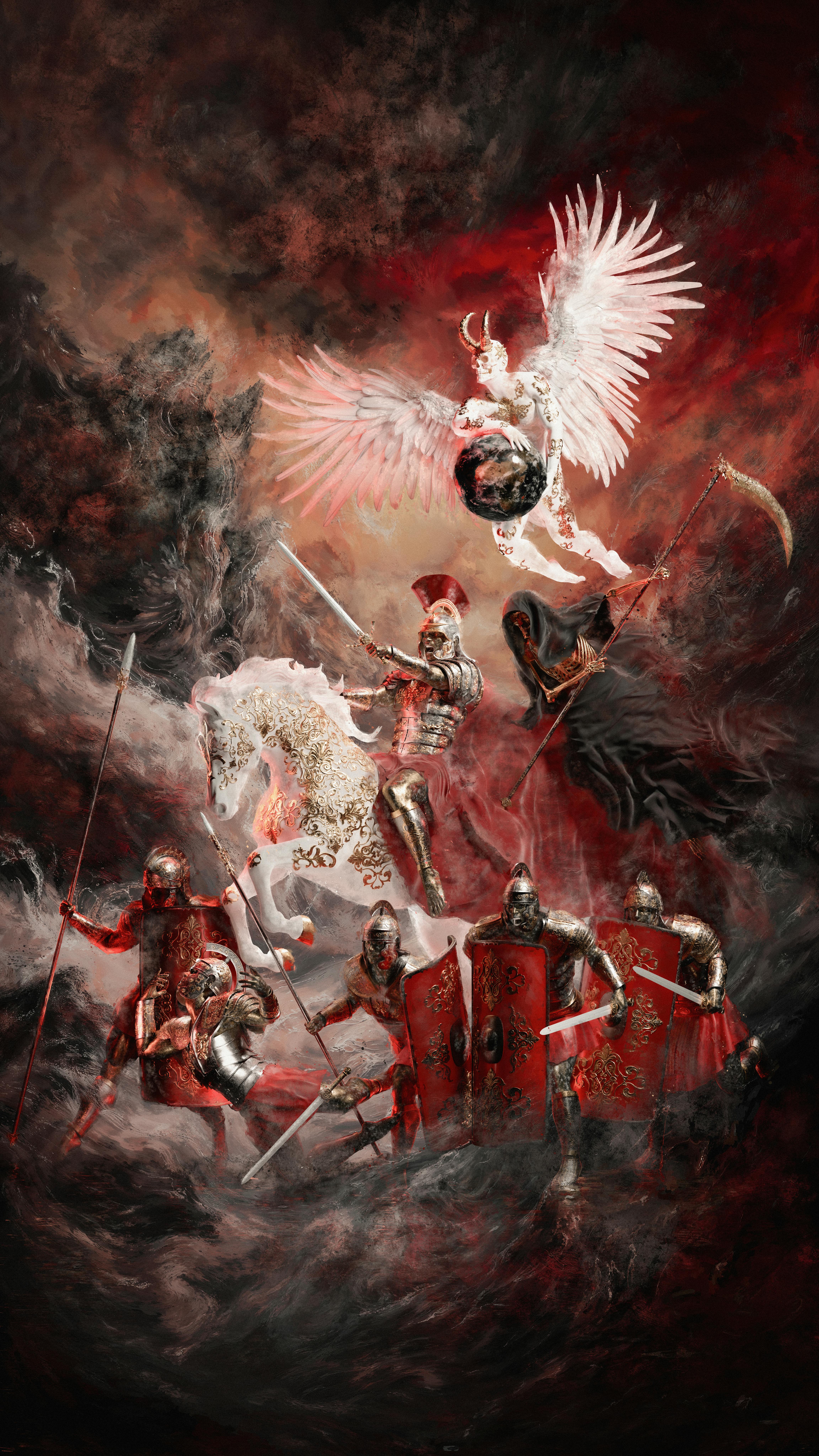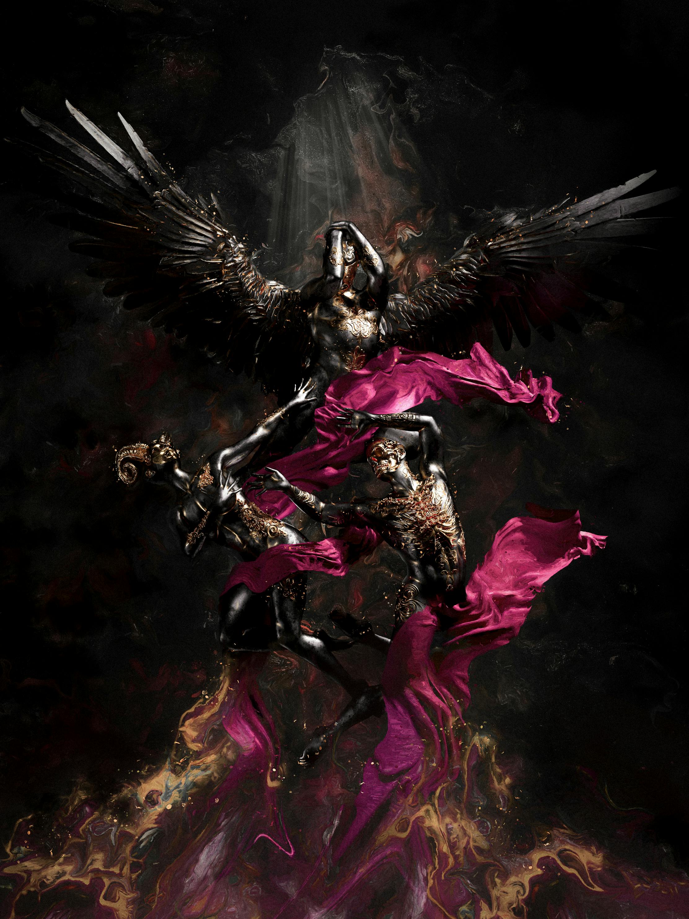 "Usque ad Mortem" (latin for "until death”, here "until death do us part") depicts the moment two lovers are forever separated by death. Struck with grief and panic, they are fighting the angel of death while at the same time submitting to their fate. In a desperate attempt of protecting her lover – who is, in his last moments, still reaching for her – the female figure is pushing away the angel, the emotional expression of which is concealed by an ornated mask.