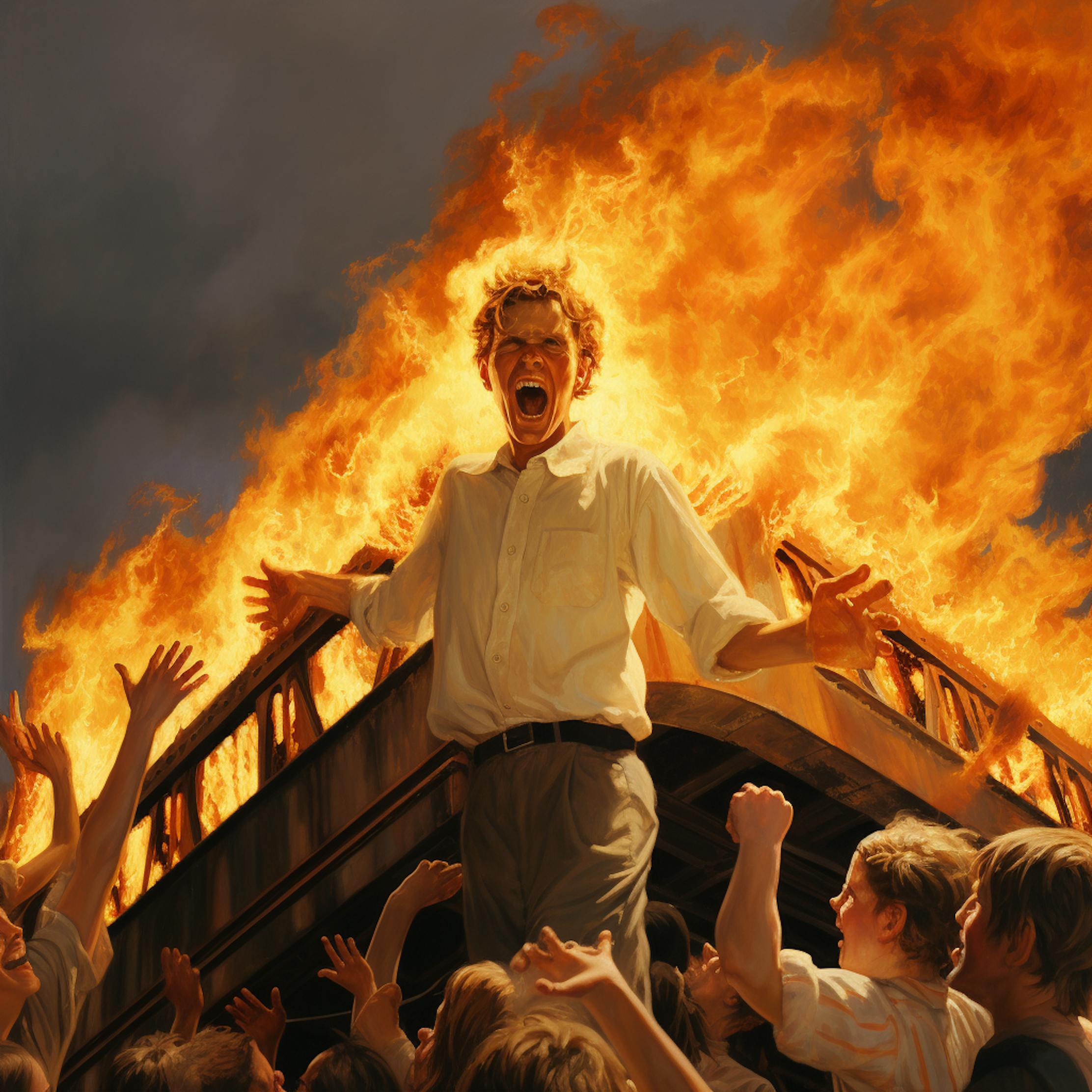 Contrasting the gigapixel intricacy of my signature work, this collection embraces the ethos of "Low Effort NFTs," staying true to AI's default resolutions and resisting the urge to upscale. Conceptually, however, I was unable to abide to low effort. Within the crypto realm, both 'bridge' and 'burning' resonate with literal and metaphorical significance. Each of these 250 NFTs, on one level or another, grapples with the theme of burning bridges—often taboo in many cultural circles, yet an essential tactic in wars and the most genuine revolutions of both culture and the soul of individuals yearning to break free from extractive systems of co-option.