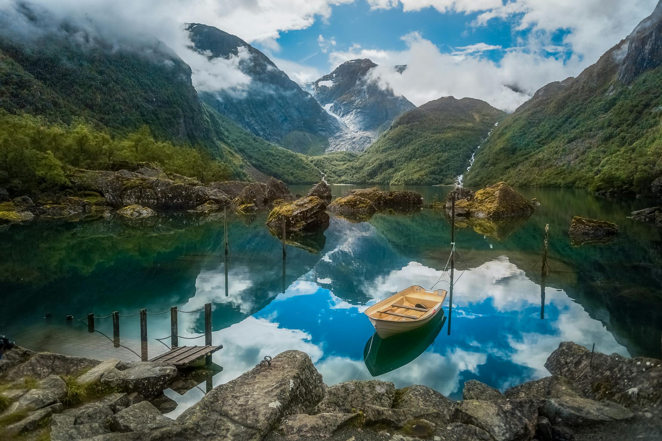We were pleasantly surprised to find Bondhusvatnet at the end of a short amble in the rain during our hiking honeymoon in Norway. The water was completely still and afforded perfect reflections (and a clear view of the rocks below). Our favorite part was the rowboat sitting out there, quiet and alone, as if daring weary travelers to come out for a ride. We didn't take it up on its offer, but the fact that somebody built a little ramp and chained up a boat here just to find a little bit of tranquility in our busy world?