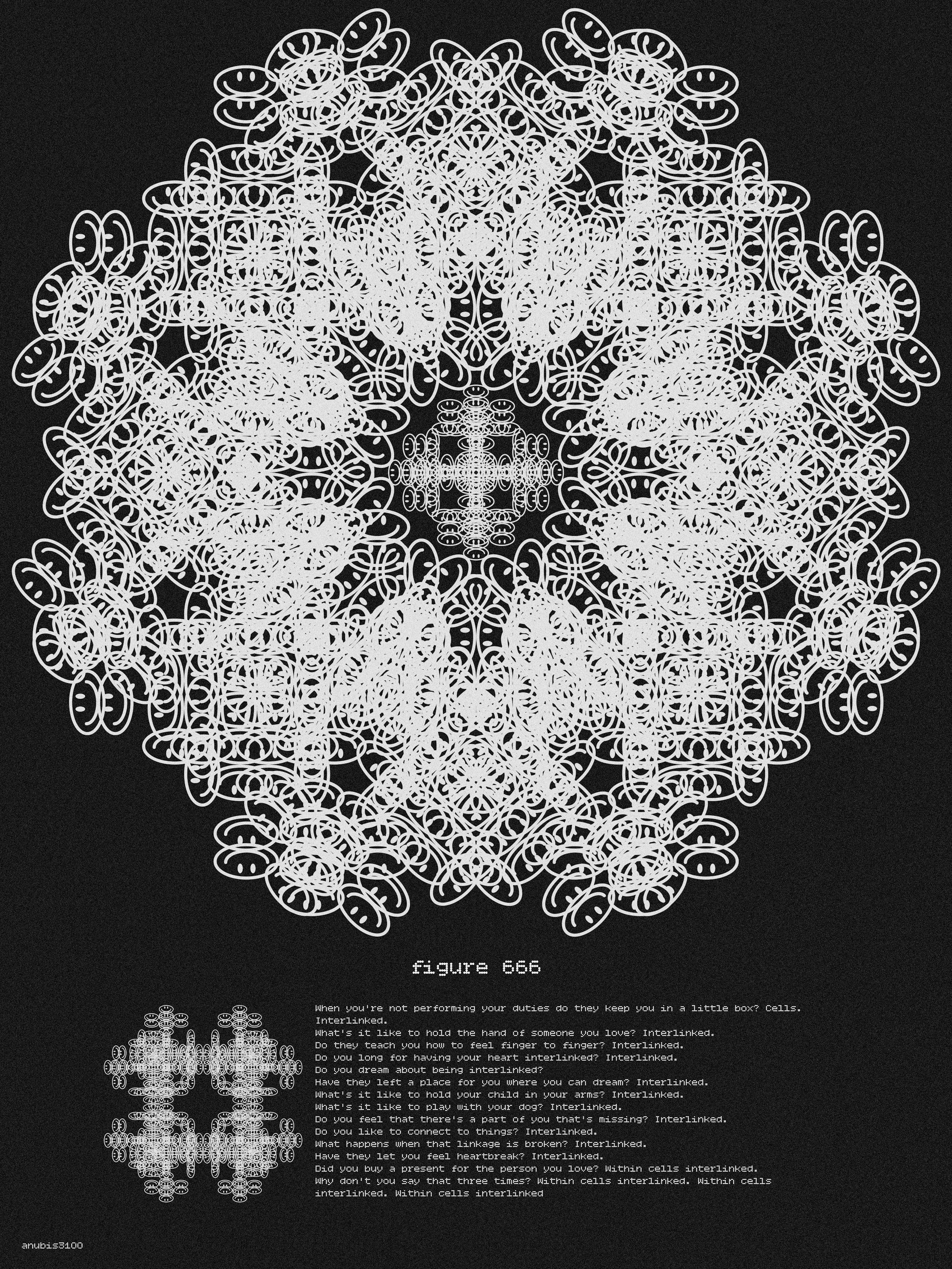 Figure 666, 𓏂 W H I T E F O U N T A I N 𓏂, Mixed Media, 5400px X 7200px, 2022, I have always been a fan of the tweets Colborn writes for the MOCA Twitter account. They are always thought-provoking in some way or another. Either through a simple use of emojis or some of the most quick-witted conceptual phrases I personally have seen. It always gives me an idea for a project. That's how 𓏂 W H I T E F O U N T A I N 𓏂 started. I remember waking up, seeing a thread of two tweets using the baseline text from Blade Runner. Knowing MOCA is fine with artists using its graphics, I sent a quick message asking if I can use both tweets for one of the photo edits I had been doing. My first attempt was not fully successful, full of too many themes, ideas, and clashing imagery. Then Colborn mentioned sacred geometry in a sentence, and I immediately knew what to do. Having grown up in Egypt, Islamic sacred geometry is inescapable. It can be found everywhere and put on almost anything, from the walls of the mosques to your everyday coffee cup. Each geometric figure containing religious thematic undertones within it. Having been interested in the processes of cultural and artistic hybridization, I thought it would be the perfect to create a small set of sacred geometry figures utilizing only one MOCA graphic each. The baseline text really interested me, as I had always viewed Blade Runner as a movie with heavy religious undertones. With the biggest one being the created meeting their creator. It was perfect for the sacred geometry figures. A simple yet extremely conceptual, and complex text seemed only fitting for such a simple yet complex geometric figures. The numbers chosen for the figures themselves are used to introduce a fun element of meme culture (utilizing meme numbers). It has become very clear in the last 10 years or so that memes can be as strong and as far-reaching as art. Even MOCA incorporated these meme elements within the ROOMs. I knew meme numbers had to be used. Perfectly fitting the conceptuality of the work. I AM A CHILD OF THE INTERNET, AFTER ALL! 𓁏