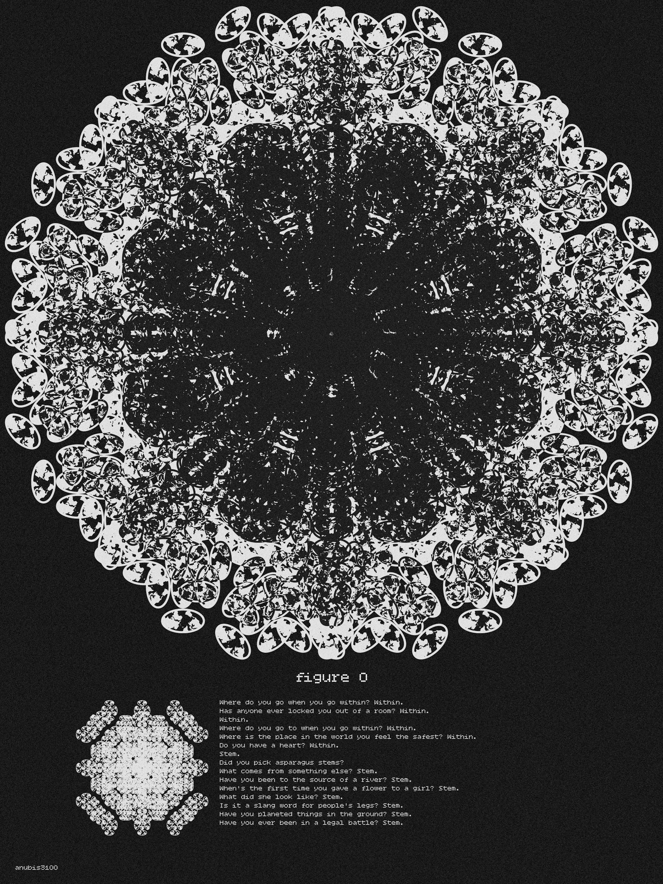 Figure 0, 𓏂 W H I T E F O U N T A I N 𓏂, Mixed Media, 5400px X 7200px, 2022, I have always been a fan of the tweets Colborn writes for the MOCA Twitter account. They are always thought-provoking in some way or another. Either through a simple use of emojis or some of the most quick-witted conceptual phrases I personally have seen. It always gives me an idea for a project. That's how 𓏂 W H I T E F O U N T A I N 𓏂 started. I remember waking up, seeing a thread of two tweets using the baseline text from Blade Runner. Knowing MOCA is fine with artists using its graphics, I sent a quick message asking if I can use both tweets for one of the photo edits I had been doing. My first attempt was not fully successful, full of too many themes, ideas, and clashing imagery. Then Colborn mentioned sacred geometry in a sentence, and I immediately knew what to do. Having grown up in Egypt, Islamic sacred geometry is inescapable. It can be found everywhere and put on almost anything, from the walls of the mosques to your everyday coffee cup. Each geometric figure containing religious thematic undertones within it. Having been interested in the processes of cultural and artistic hybridization, I thought it would be the perfect to create a small set of sacred geometry figures utilizing only one MOCA graphic each. The baseline text really interested me, as I had always viewed Blade Runner as a movie with heavy religious undertones. With the biggest one being the created meeting their creator. It was perfect for the sacred geometry figures. A simple yet extremely conceptual, and complex text seemed only fitting for such a simple yet complex geometric figures. The numbers chosen for the figures themselves are used to introduce a fun element of meme culture (utilizing meme numbers). It has become very clear in the last 10 years or so that memes can be as strong and as far-reaching as art. Even MOCA incorporated these meme elements within the ROOMs. I knew meme numbers had to be used. Perfectly fitting the conceptuality of the work. I AM A CHILD OF THE INTERNET, AFTER ALL! 𓁏
