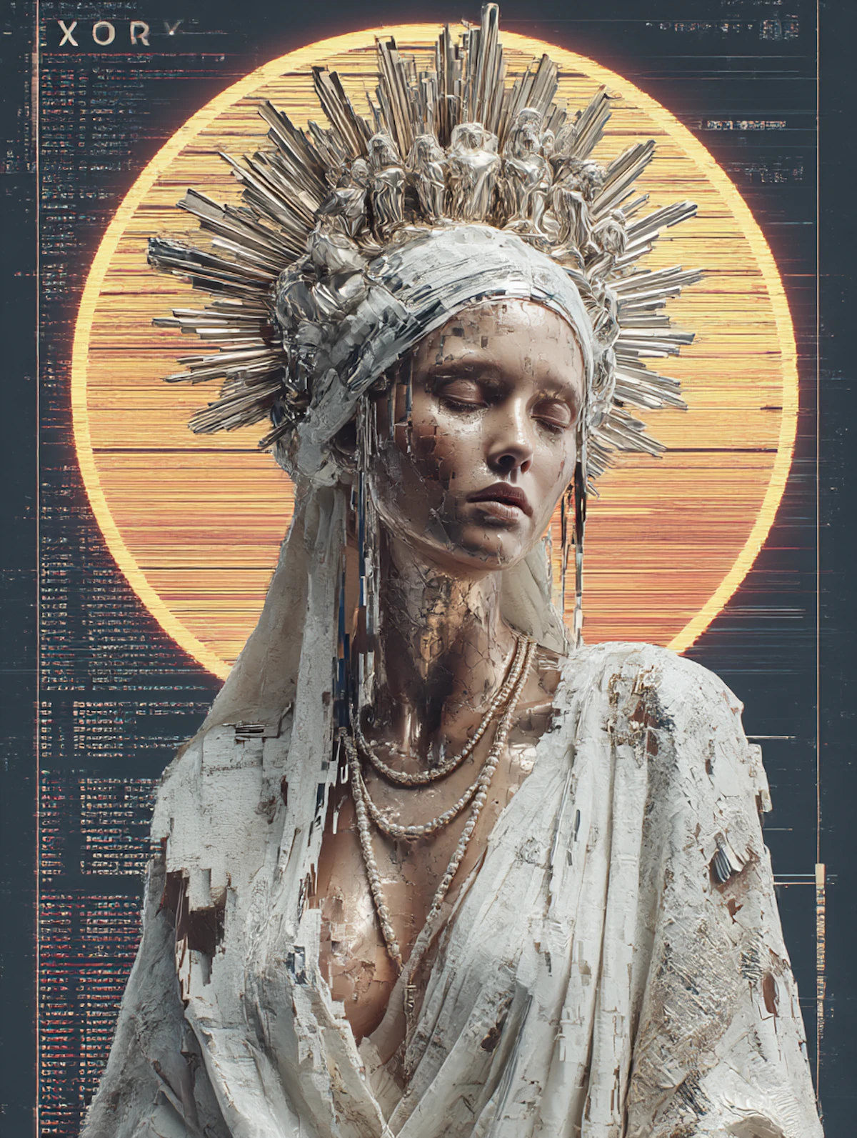 These goddess-like figures, carved from glitch and light, are mirrors of that journey, symbols of rebuilding a self from fractured data. The corrupted code woven through my art is not just an aesthetic; it is my signature, my proof that I can still create after everything was rewritten.