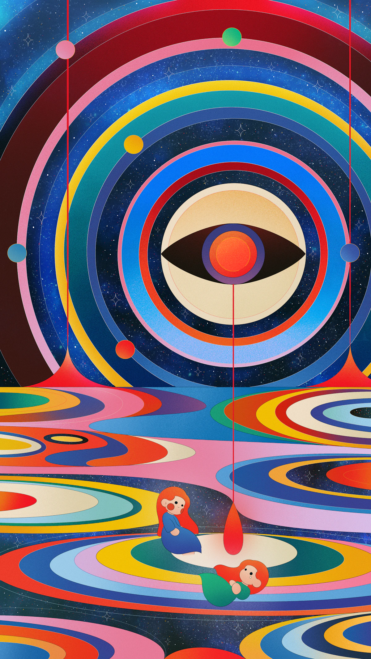 In a kaleidoscope of spirals colors twist and pull everything back to the center toys, creatures, fragments of memory. At the heart floats a childlike figure suspended between wonder and weight. The force is not outside but within the gravity of thoughts and feelings we cannot yet let go
