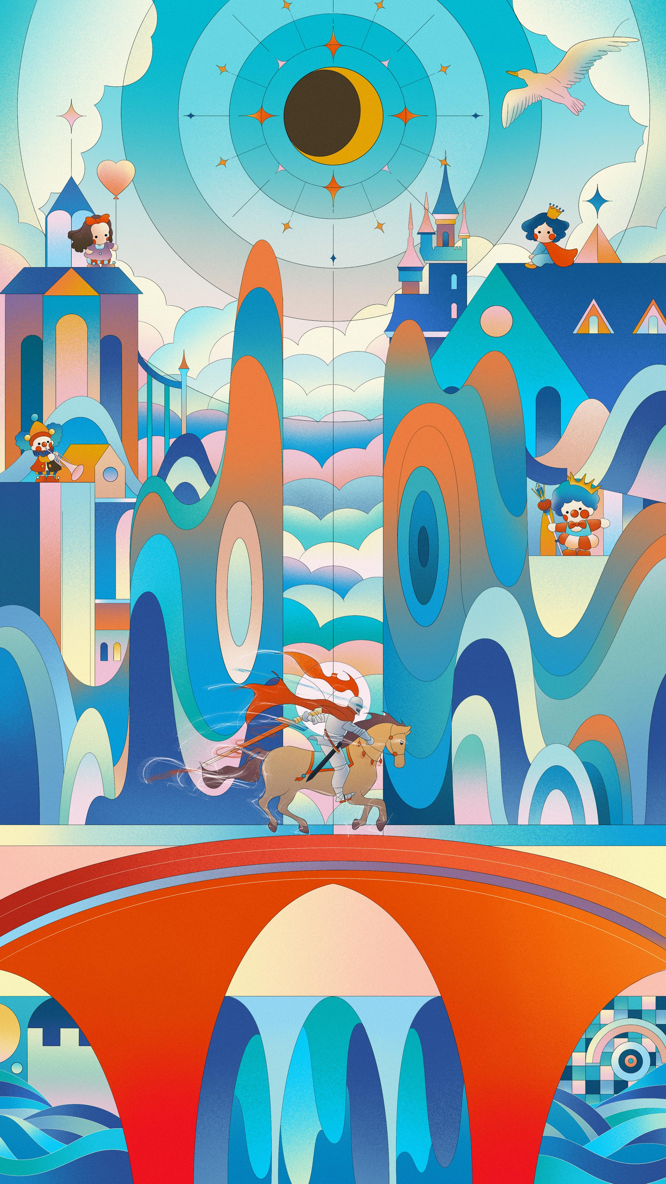 A knight rides across a fiery bridge beneath a cosmic sky on the threshold of a new era. Between hesitation and becoming, every journey has its crossing