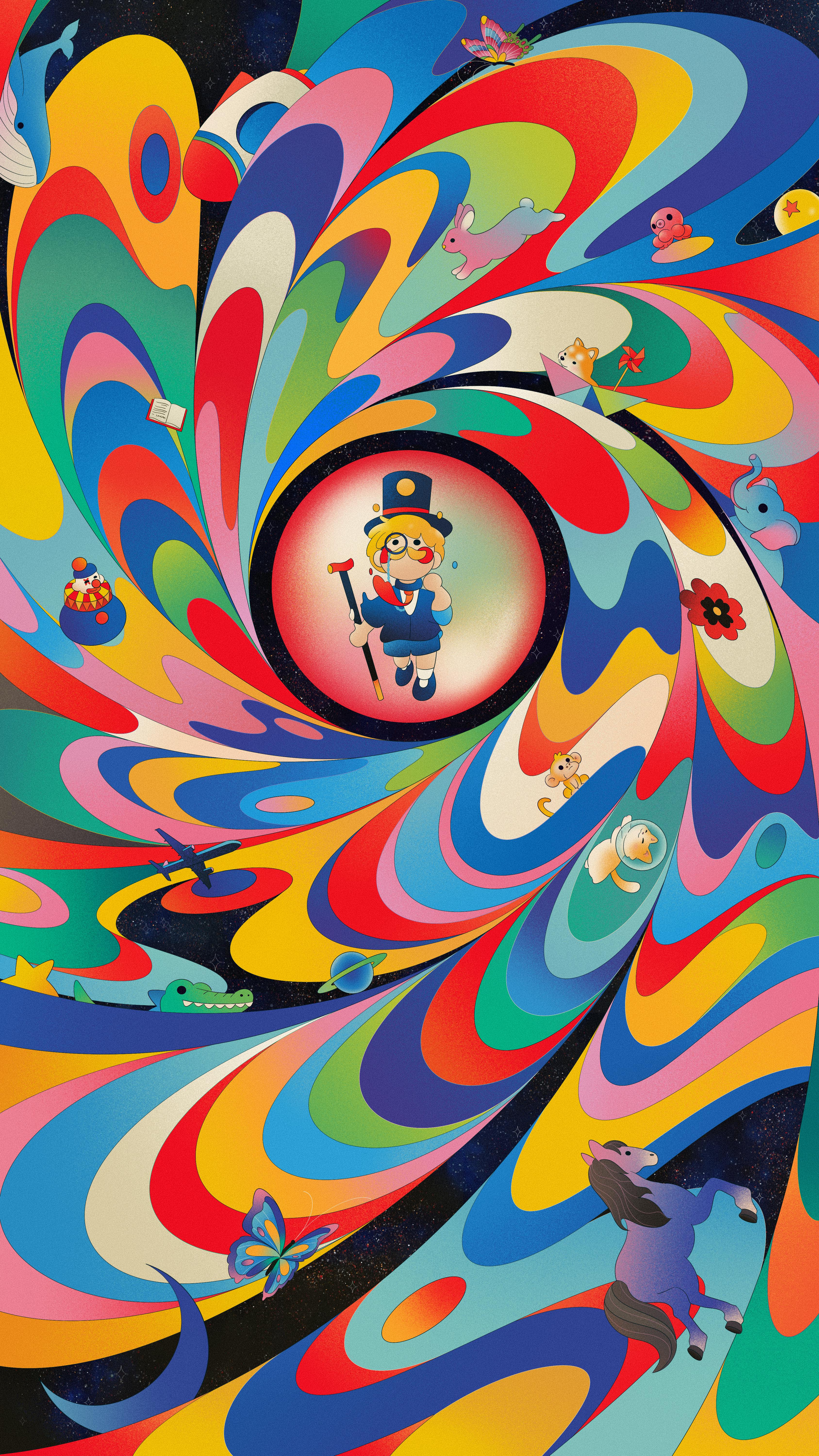 A red sun glows above the sky. Smoke rises from a quiet house fading into the vast night. Among rainbow hills and blooming forms, hope drifts softly through the silence.