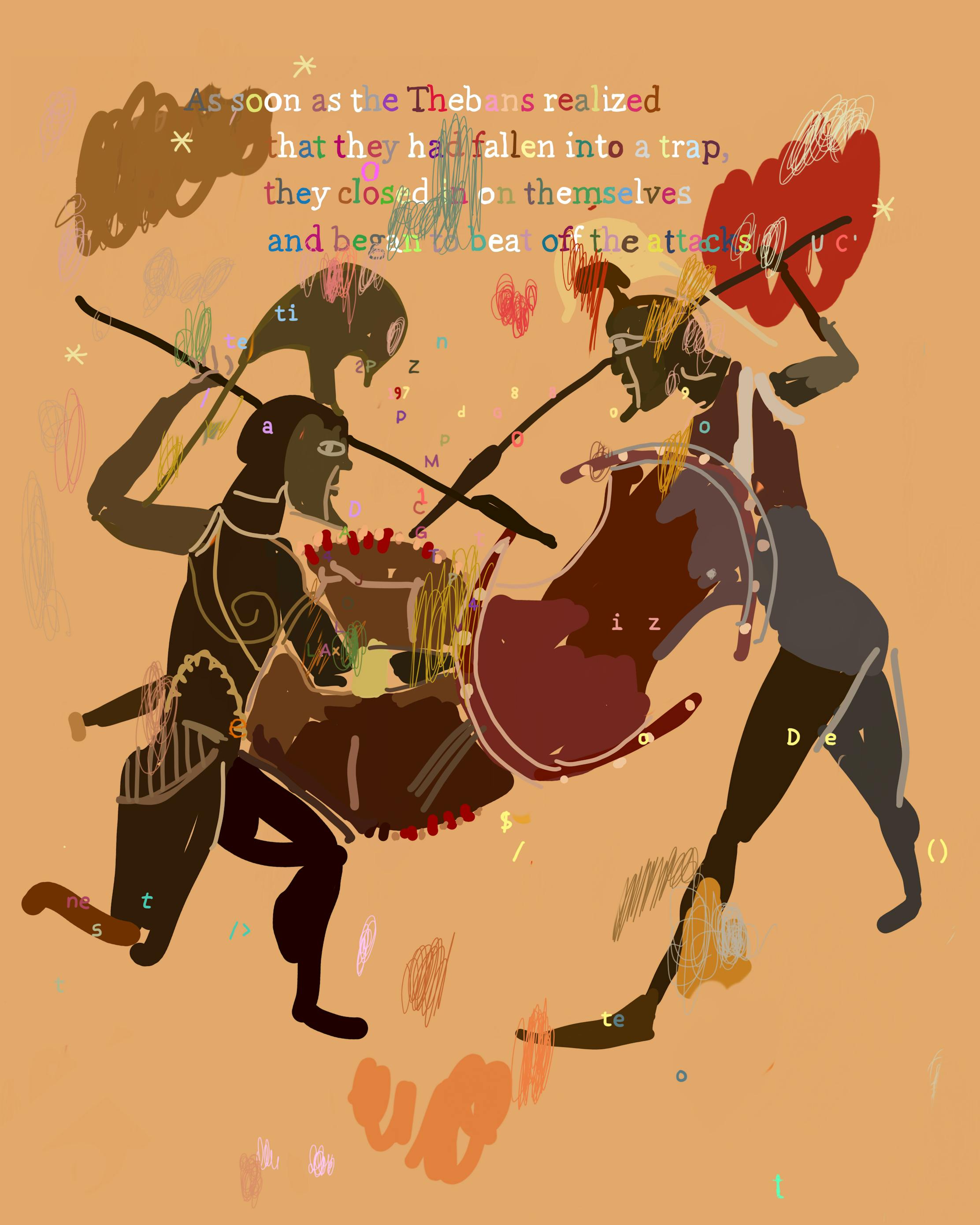 "As soon as the Thebans realized that they had fallen into a trap, they closed in on themselves and began to beat off the attacks."