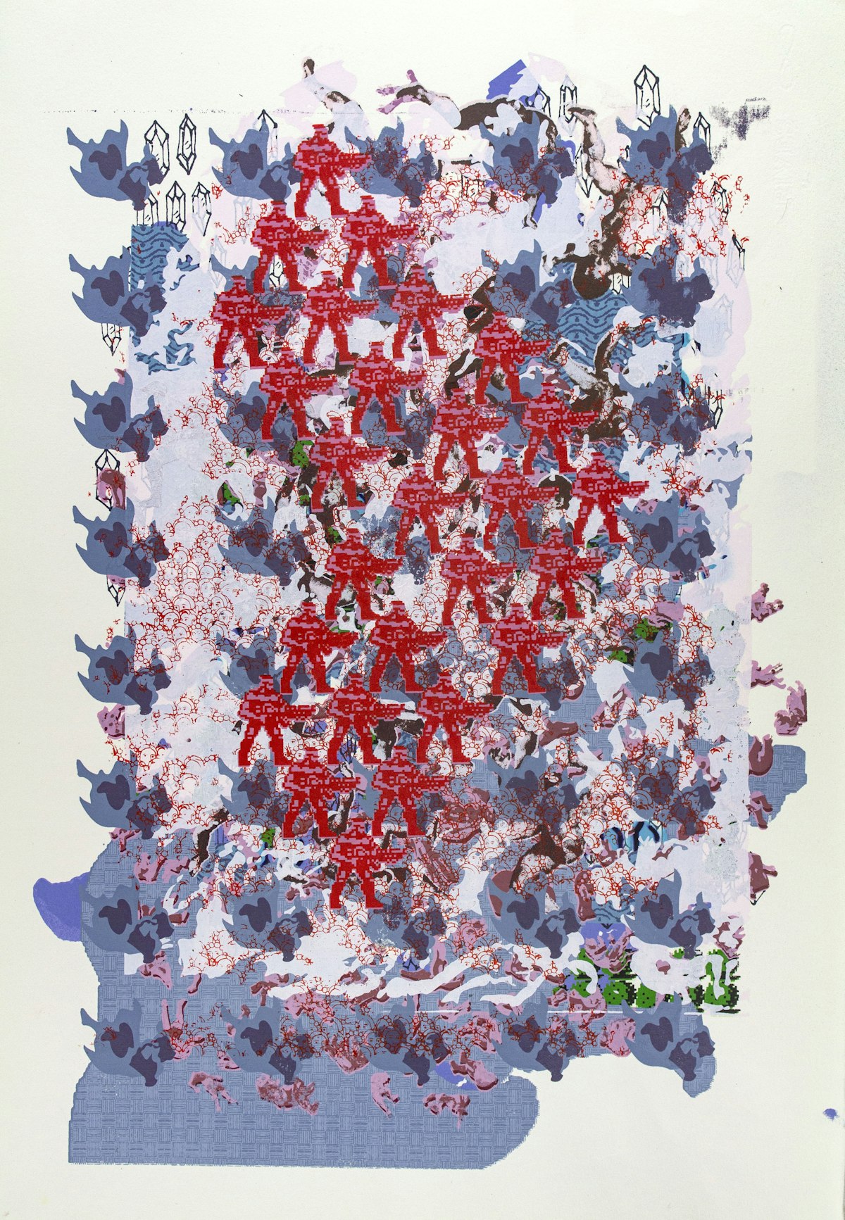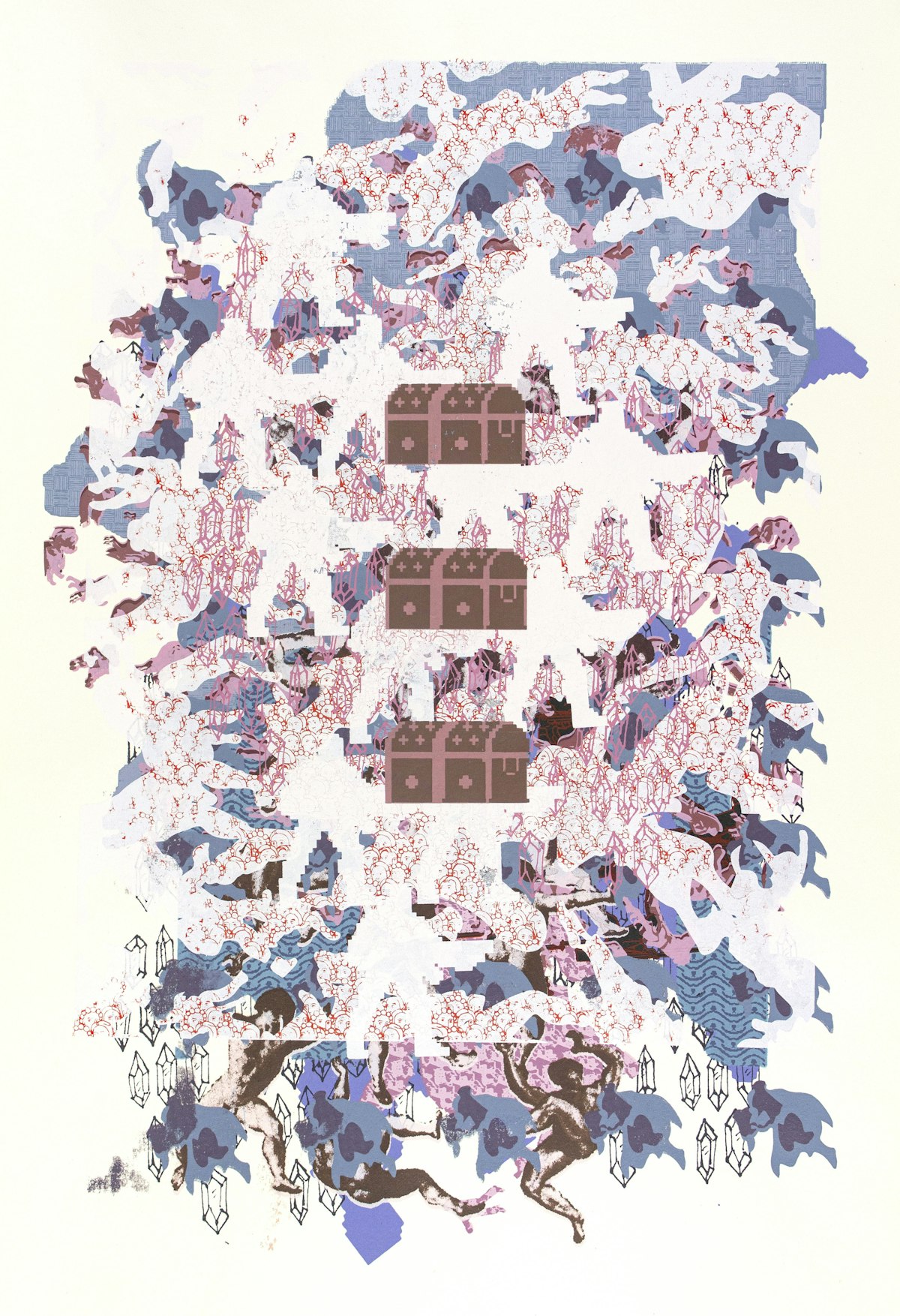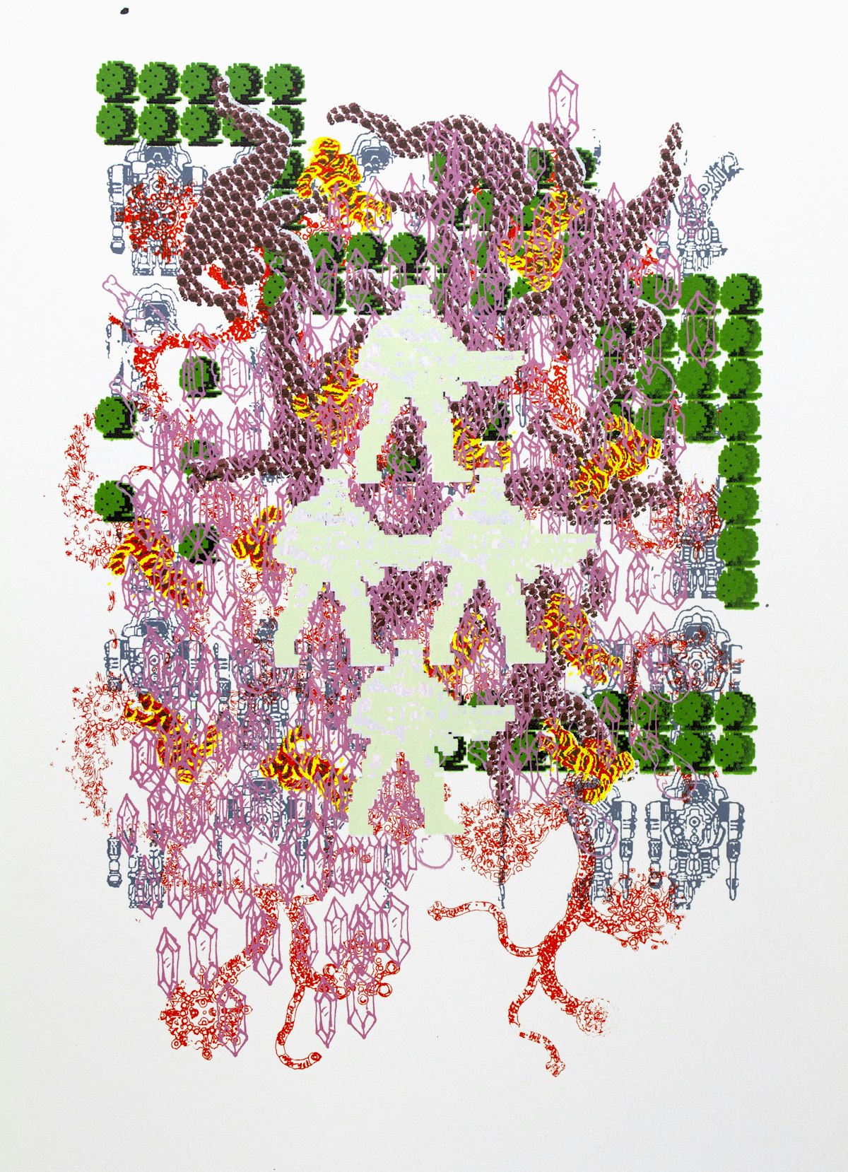 This print is a unique one-of-one work which was built layer by layer with no pre-determined solution. Each layer was placed intuitively to respond to and cover up the previous choices. Many of the repeated motifs in the prints are abstracted from 8- and 16-bit video games and reflect on themes such as unrest, resolve, reward and consequence.