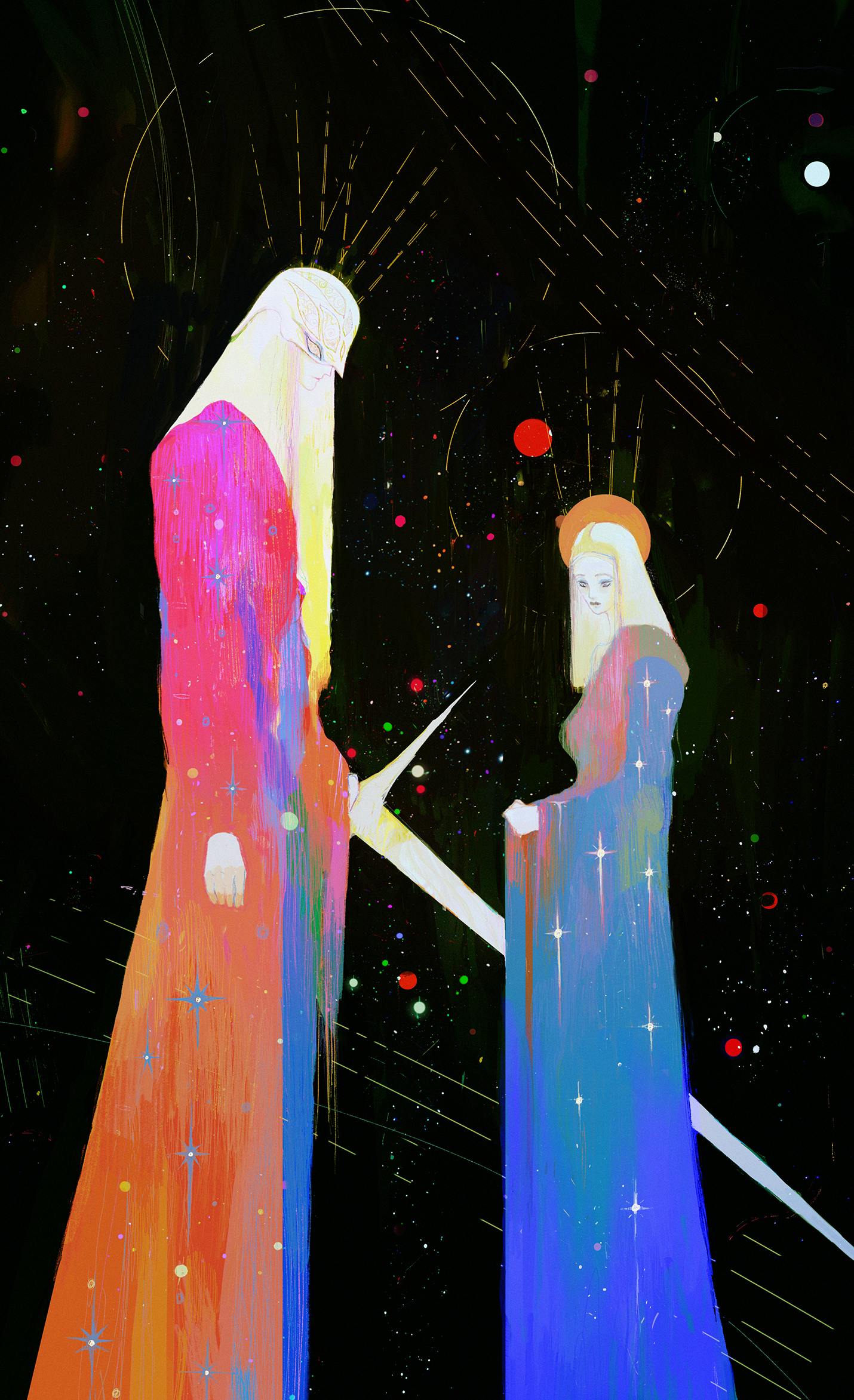 Mira, looking away, was not ready to say goodbye. She had asked the Knight to meet her one last time before he embarked on his journey. His task was to guide the suns of old galaxies to a safe slumber with his great sword, Sun Eater. It was said Sun Eater was forged from the fragments of the Ending Blade. Mira herself had an important task: bringing fortune and long life to the living worlds. They were deeply in love and stood heartbroken.