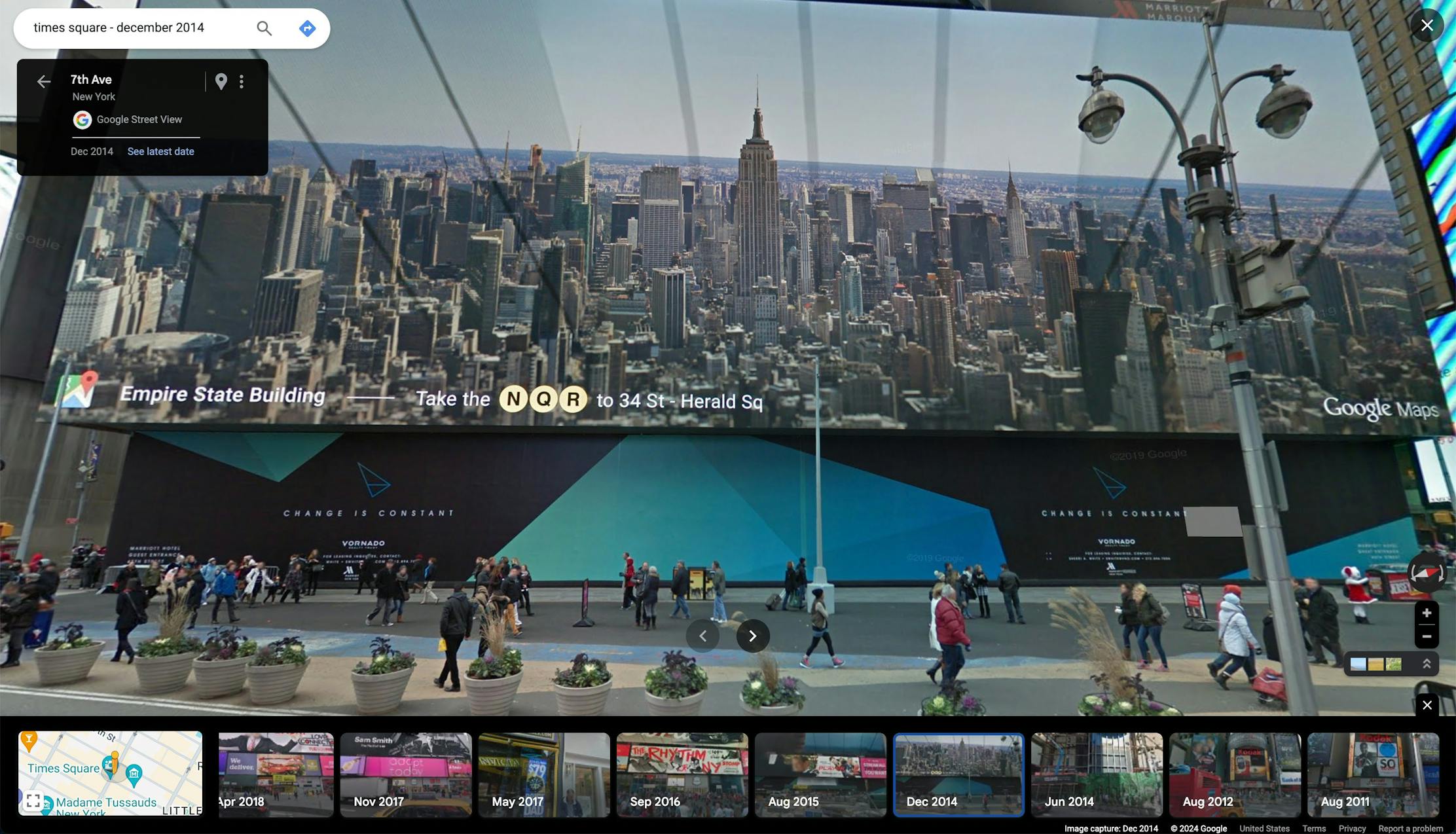 This conceptual artwork captures a meta-moment in digital cartography and urban experience. The piece presents a Google Street View image of Times Square in New York City from December 2014, creating a layered representation of how we perceive and navigate urban spaces in the digital age.