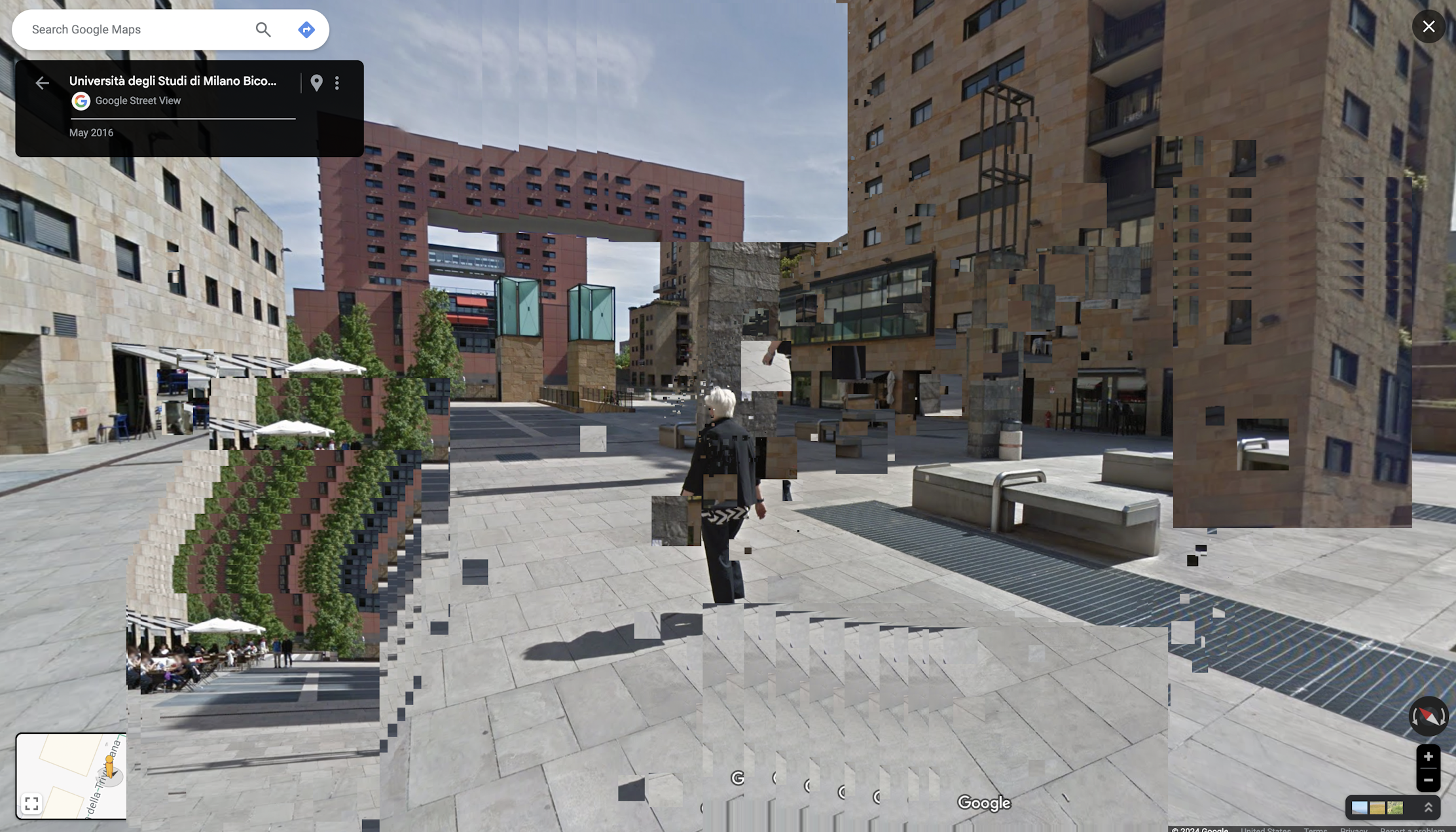 Here I glitched screenshot of a Google Street View scene depicting the plaza outside the Università degli Studi di Milano, taken in May 2016. I used digital processing to create a distorted, pixelated effect, blending the architectural elements and introducing a sense of fragmentation and disruption.