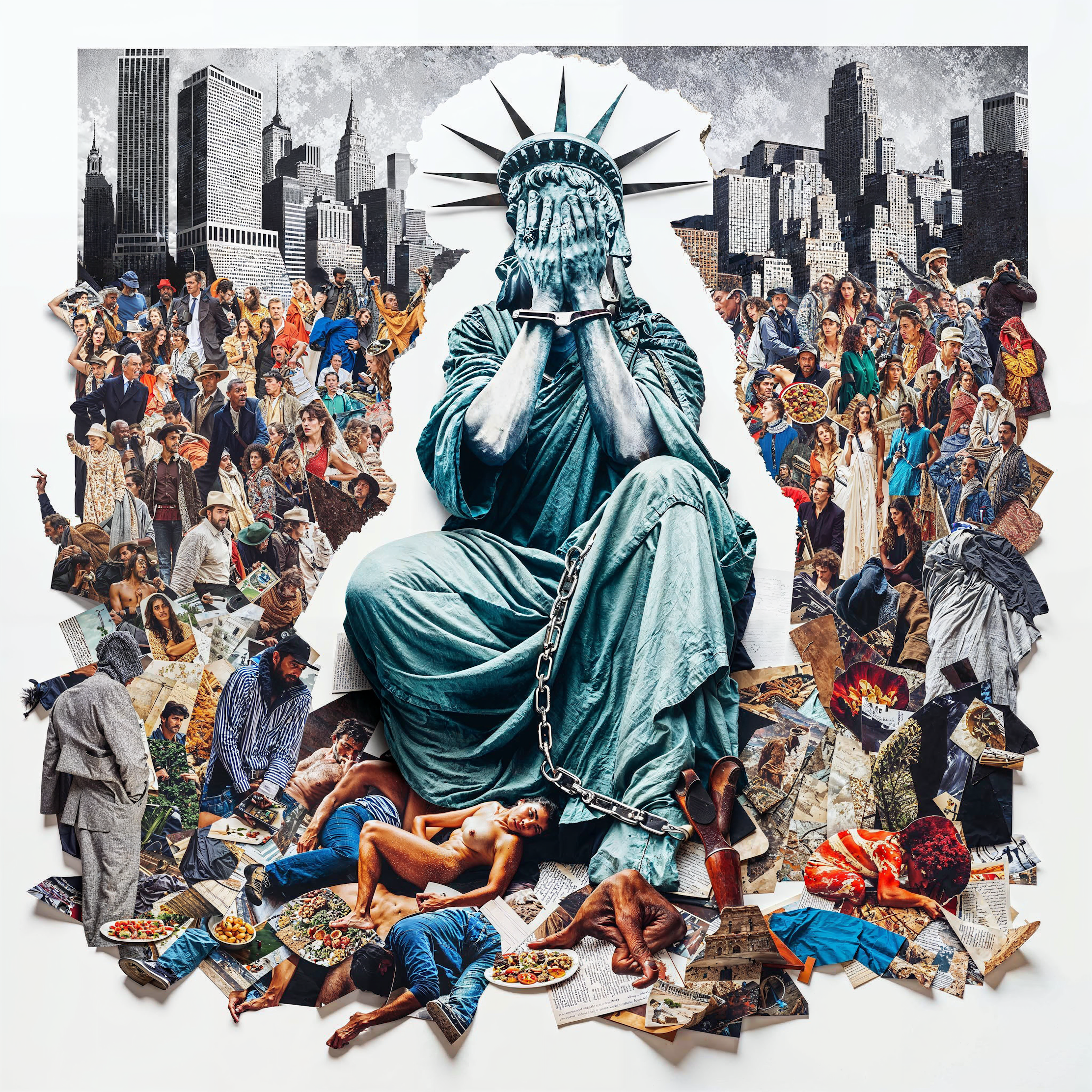 ChatGPT: How about an image of the Statue of Liberty, not standing tall as she usually does, but sitting down, covering her eyes, as if she's unable to bear what she sees? Her hands could be in handcuffs, symbolizing the constraints on freedom. Around her, we could depict worn-down, broken people who’ve lost everything, lying at her feet in a crumbling New York City, representing the crumbling promises of the American Dream.