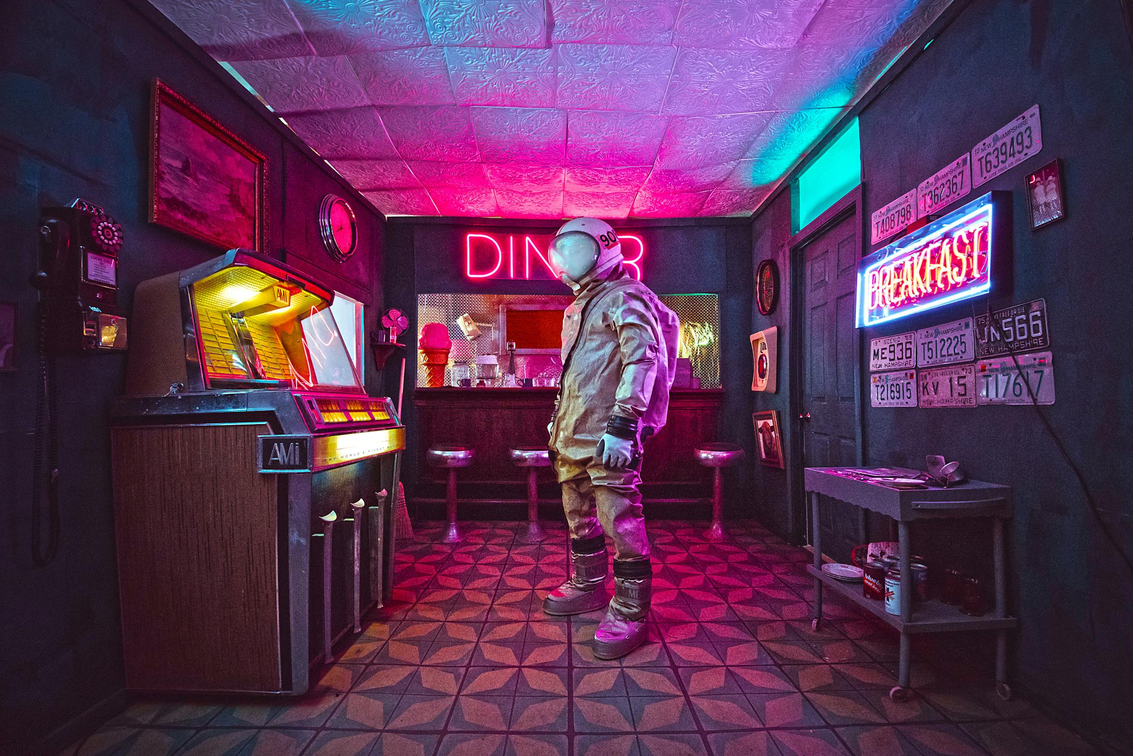 My friend Gregory Pierce (an amazing stop animation artist) in an authentic NASA S.C.A.P.E suit that I acquired, standing in a diner set that I built in my studio in Manchester, NH.