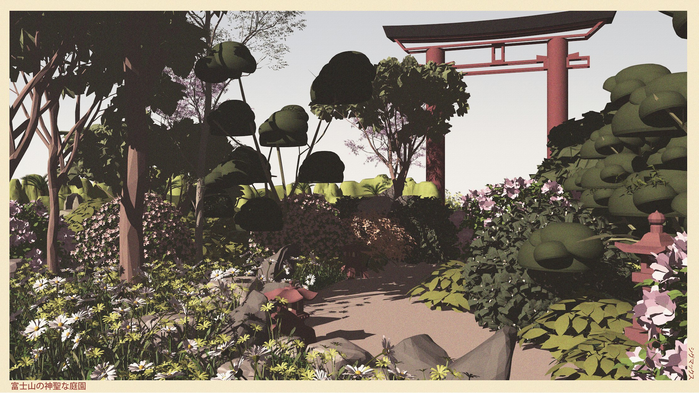 The garden path winds deliberately, never revealing its full course at once—much like our own spiritual journeys. I chose each element with purpose: the steadfast daisies reaching toward light, the rounded forms of foliage creating rhythm and balance, the soft pink blossoms adding gentle warmth to the composition.