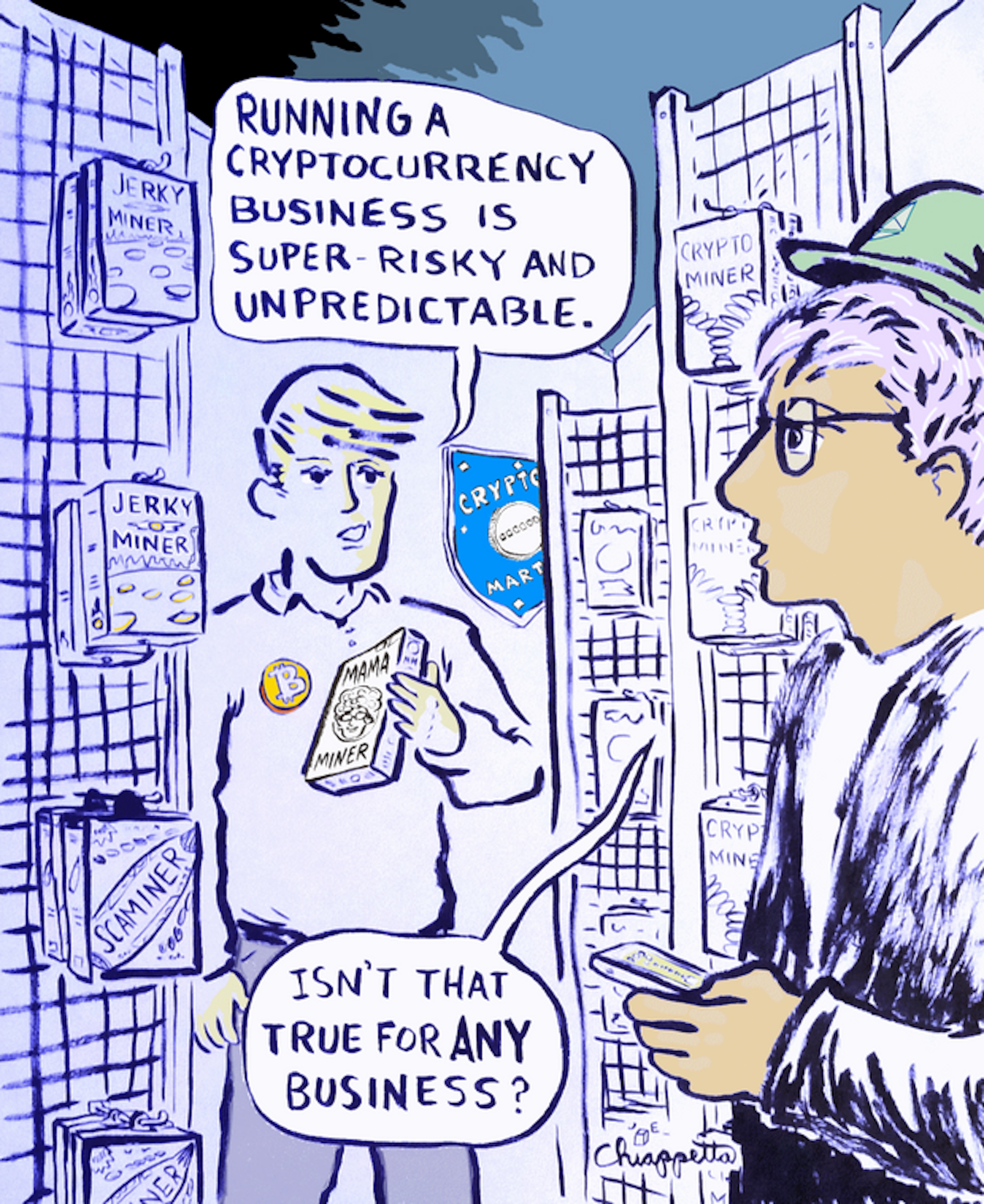 I drew this comic to poke fun at the riskiness of not just crypto-businesses, but any business venture. I first sketched the cartoon in black and white using an ink brush at the Ethereal Summit in New York City in summer 2018. Then I colored it on my touch-screen computer and invite you to join me in a lifetime of risky business.