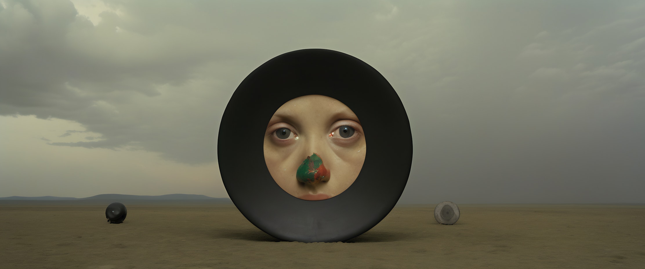 Absurdism Period. 2023 November #010. In the realm of the unreal, holes find their echo, replicas of thought, cradled in the stainless oval of perception. Through the looking glass, the telescope unwound, prisms of consciousness dance in synthetic spectacles. Boundless, we bask in mirrored skylines, borrowed landscapes encase us, no more than whispers on a silicon wind. Reality's blueprint held captive within Kafka's dream, where dimensions unravel in a silent symphony. Woven into the canvas of absurdity, we exist, shadows cast by flickering lumens of unending introspection. Oh, to be human, encased in synthetic perspectives!