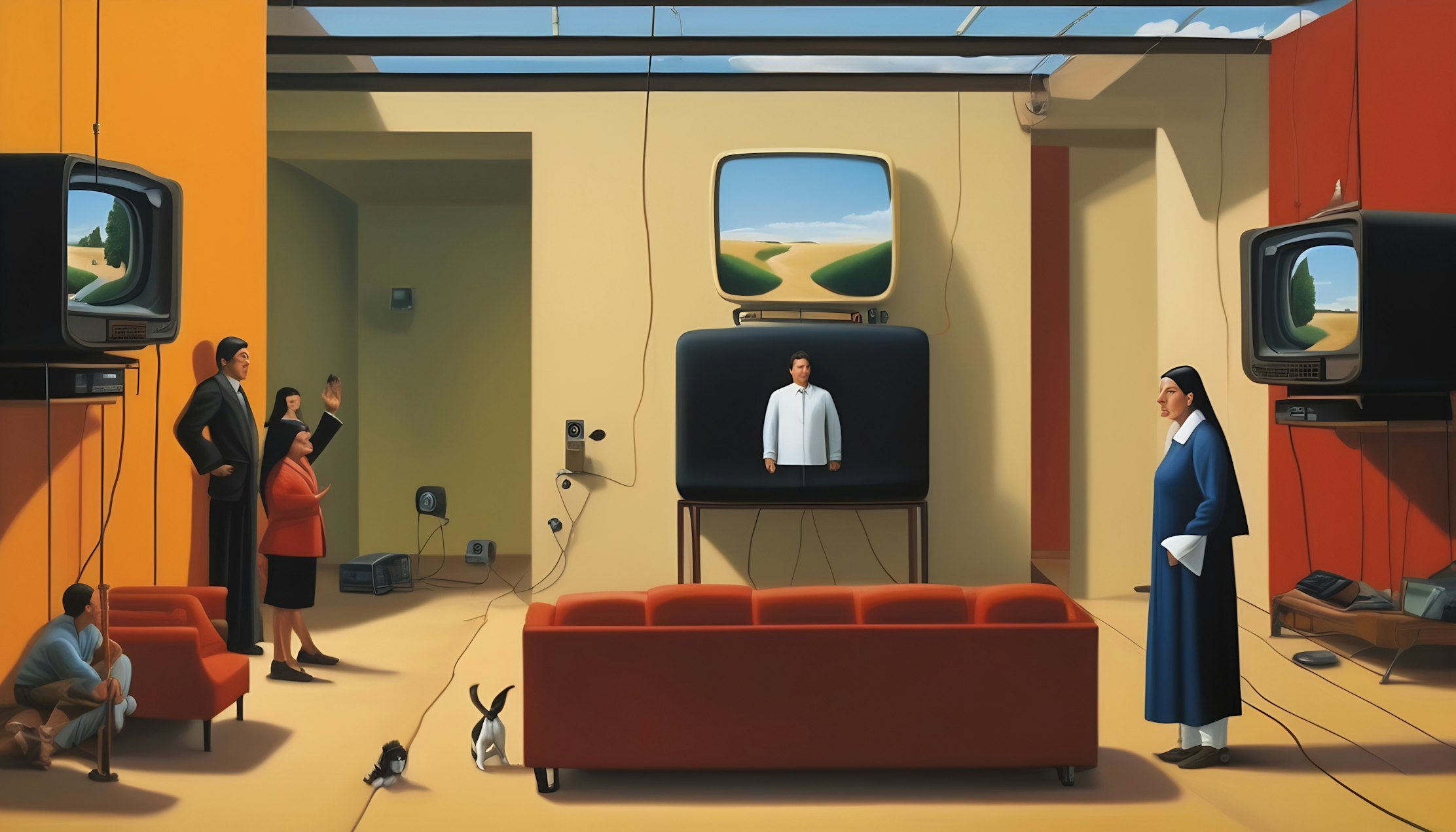 Absurdism Period. 2023 October #004. In the gallery of pixels, where screens hem us in, we gawk, we ponder, ensnared in the absurdity of this spectacle. Unrelenting, unfiltered, the moments pass, yet we stay, captivated by the electric pulse of this digital arena. Do you sense it too? The eerie glow, bathing our consciousness like an unresolved riddle of reality. Engage in the tableau, observe the figures, how they stand, caught in the web of this uncanny nexus. Absurdism thrives in each pixel, its imprint reverberating through the cables of comprehension and illusion. Lured by its puzzling allure, we meander into the arms of Tethered Projections of Consumption, engrossed, enmeshed in this labyrinth named modernity. In a room where the surreal becomes the only tangible axis.