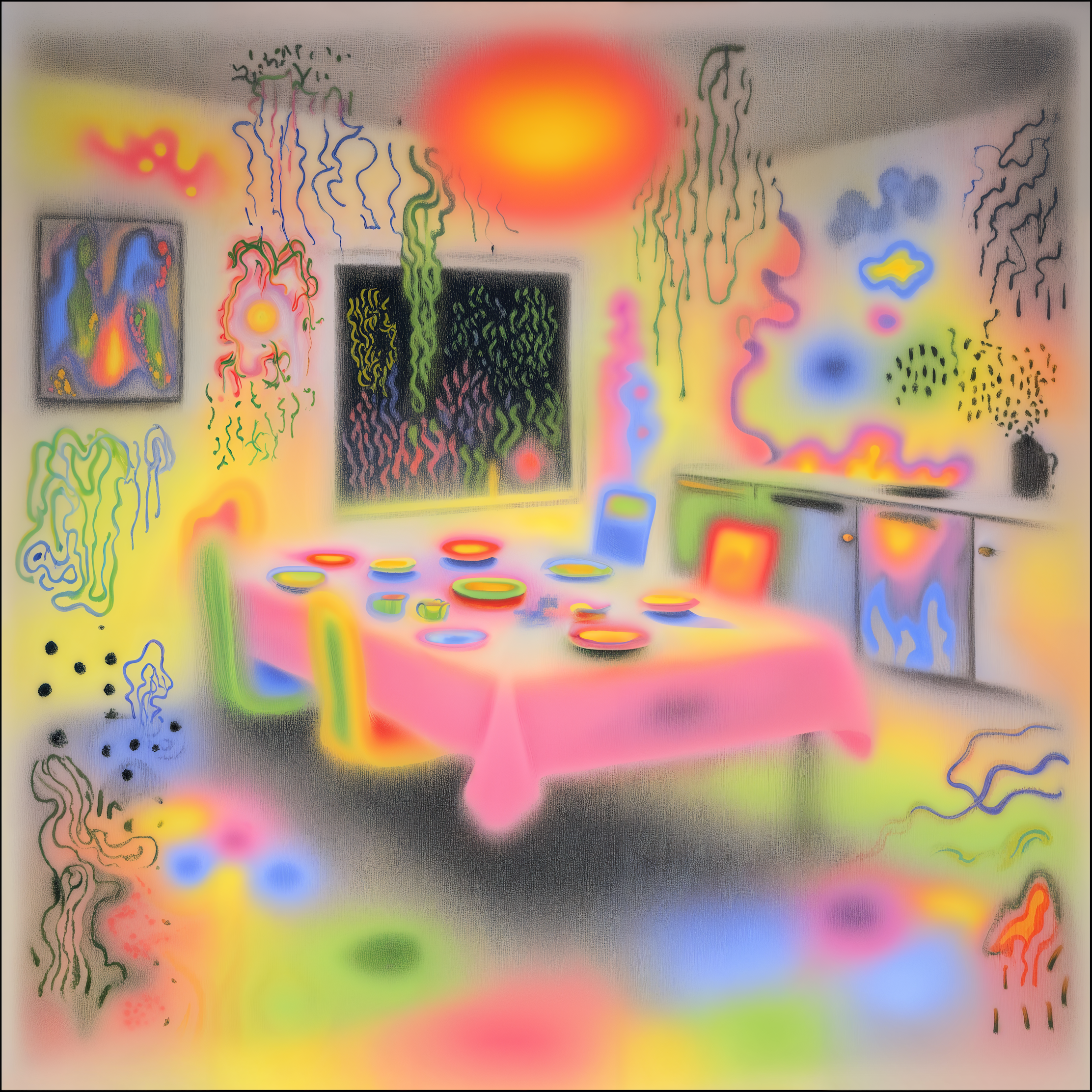 The table remains aligned to function, not memory. Plates emit residual color, an afterimage of use rather than evidence of it. No food is implied. No hunger either. The chairs are positioned correctly. They do not anticipate weight.