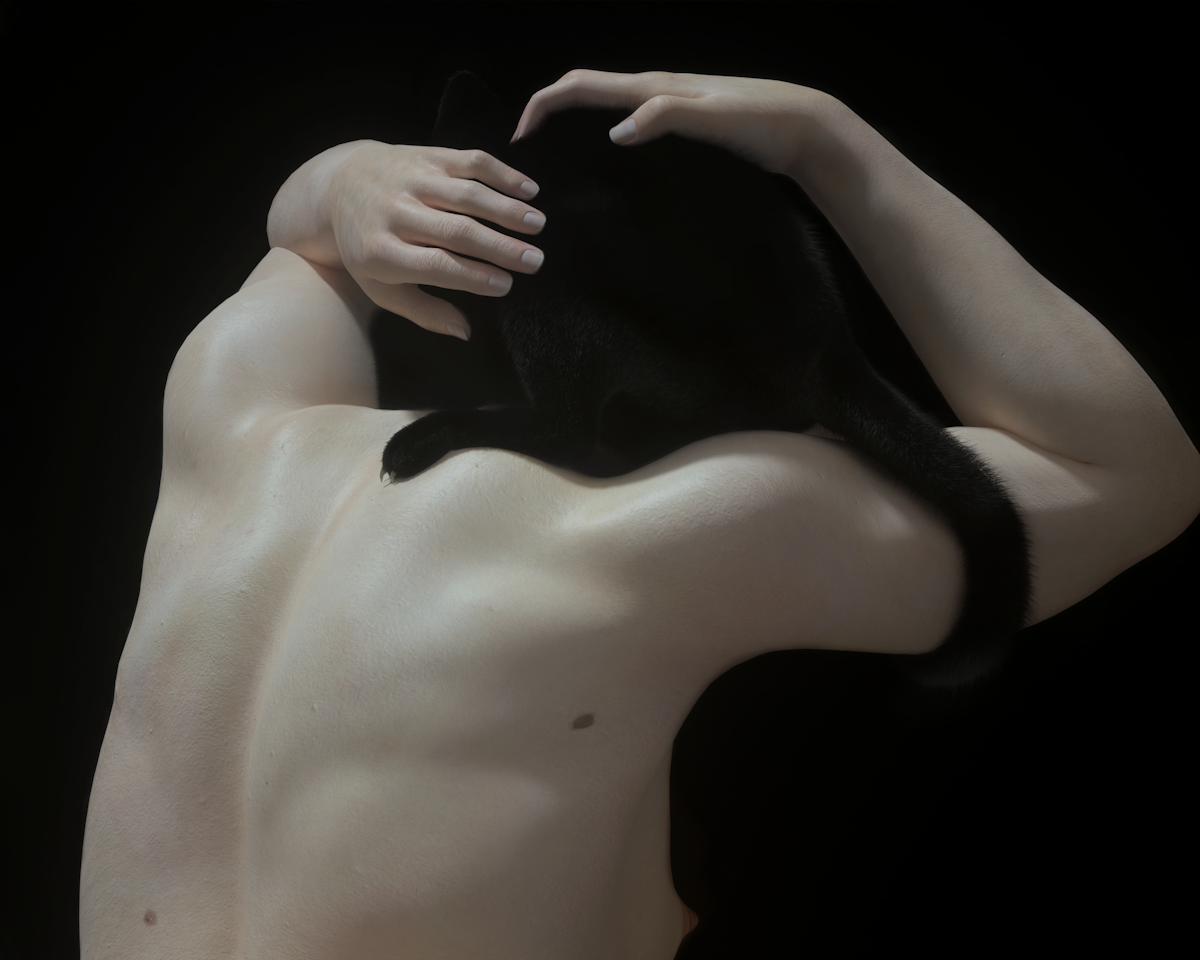 The series “Sleep Paralysis” explores the liminal time of when the mind perceives hallucinations, creatures and objects that cannot be detected when it is completely awake. In “Pandafeche” (2022), the soft profile of a black cat/incubus sits comfortably between the tights of a white androgynous body suggesting sensual and dangerous thoughts.