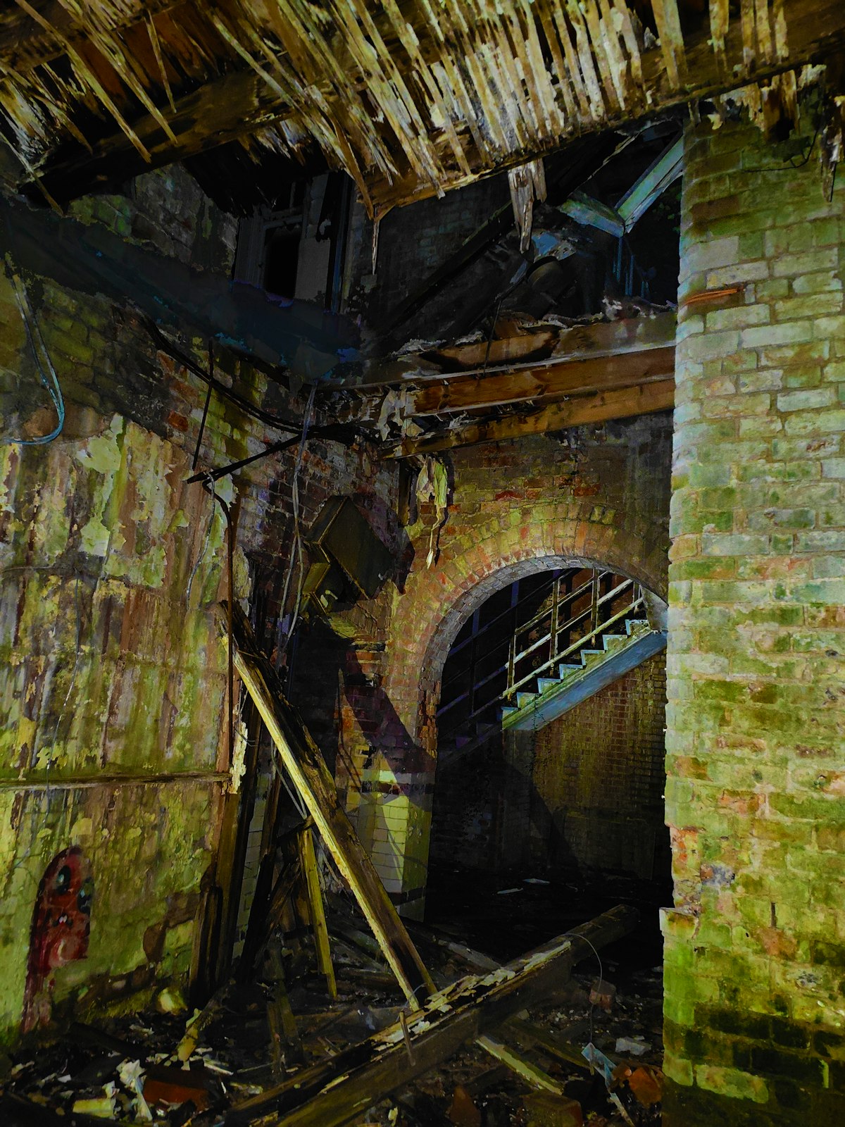 Photographed under cover of night, this image captures the decaying shell of a psychiatric hospital that once housed thousands. Within its walls, treatments ranged from compassionate care to now-condemned practices like electroshock and lobotomies. The silence of the ruins speaks to both the suffering endured and the lives forgotten, a stark reflection on the shadows of institutional history.