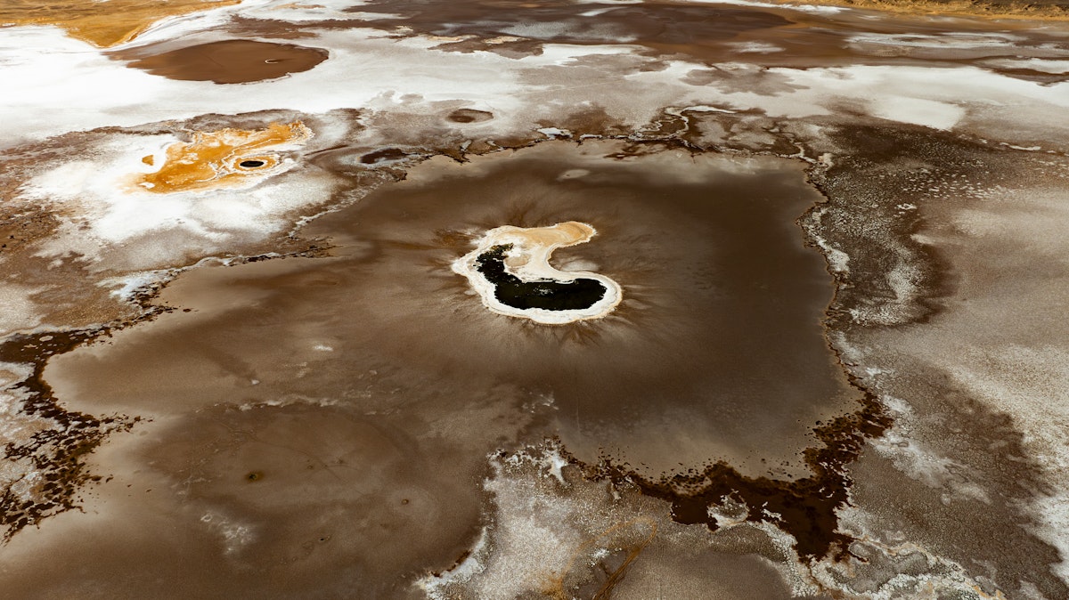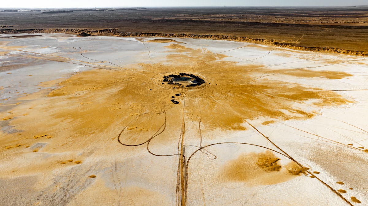 Right on the border with Tunisia, about 50 km from Ghadames, there is a salt flat called Sabkhat Mujazzam, where Ain Eddban lies. The name derives from Arabic and refers to the two adjacent lakes which, when seen from above, resemble the eyes of a fly. This area, considered a depression, was most likely a salt lake that has now dried up, revealing two small lakes, one freshwater and one saltwater. An extremely mysterious place that remains poorly documented to this day.