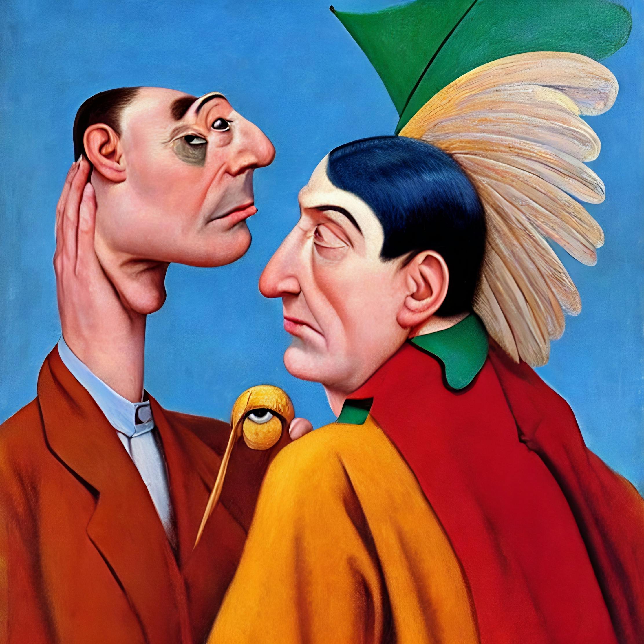 2025 August #005. Two elongated figures face each other across an impossible distance that feels both intimate and vast, their porcelain features catching light against a sky of pure cerulean. The figure on the left, draped in earthen brown, regards their companion with quiet intensity, while the other—crowned with elaborate plumage of cream and emerald—meets this gaze from within cascading crimson robes. Between them hovers a small golden orb, suspended like a word waiting to be spoken, a meaning in transit.