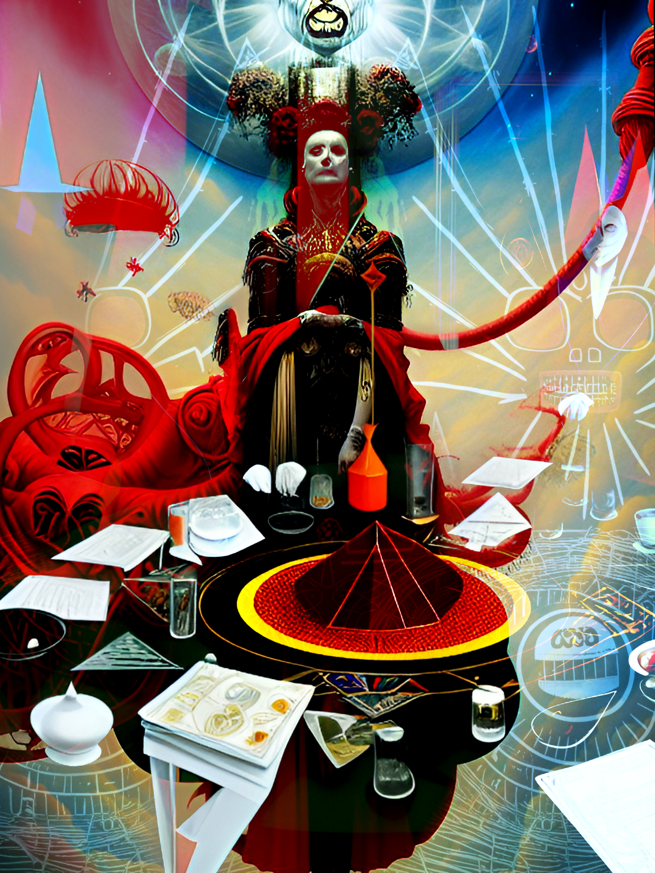 In her solace, the alchemist, silhouetted by the moon,