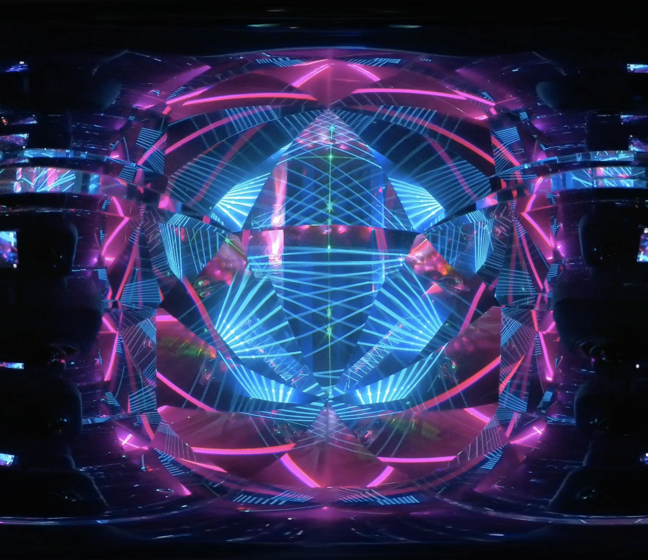 A set of videos taken of a physical laser install inside of LaserLewDude's closet. The physical setup consists of lasers, glass and mirrors (setup details below). This piece has an selectable focal length that can be changed by clicking on the icon in the bottom right to reveal the focus menu. Options are then Far / Mid / Near that will reload the piece with the corresponding focal length.