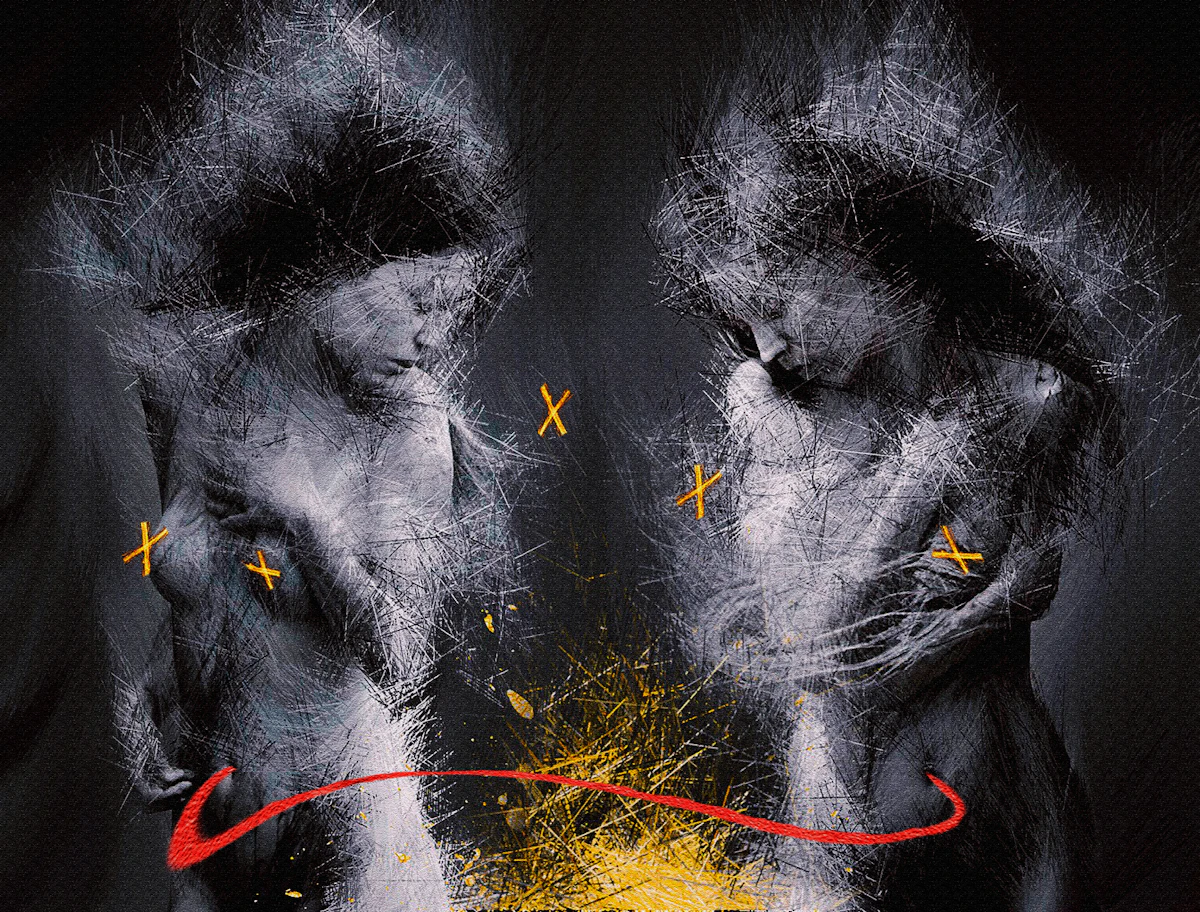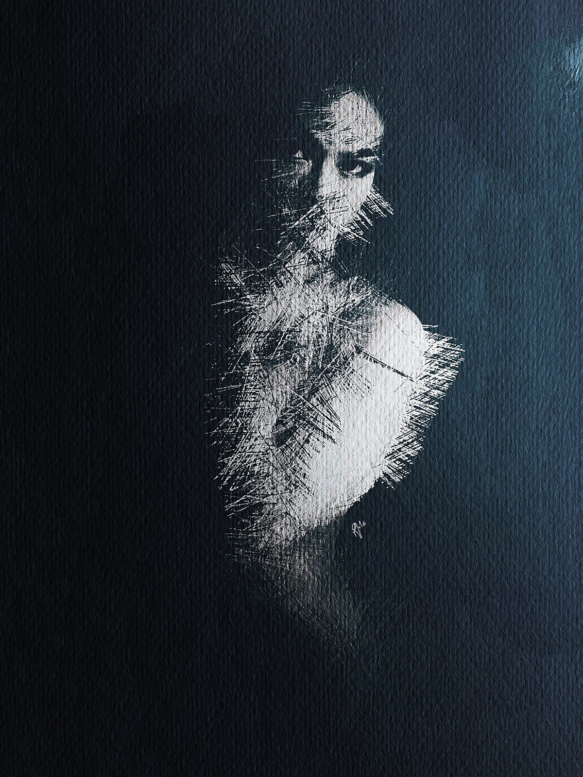 This abstract portrait expresses the moment when memory stings as much as reality. The figure tries to hide their gaze behind a storm of strokes and splashes, as if covering their eyes could erase the absence of the loved one. But the face, especially the mouth and the silent tension it conveys, remains exposed, reminding us that even when one doesn’t want to look, the memory persists and slips through the veils of thought.