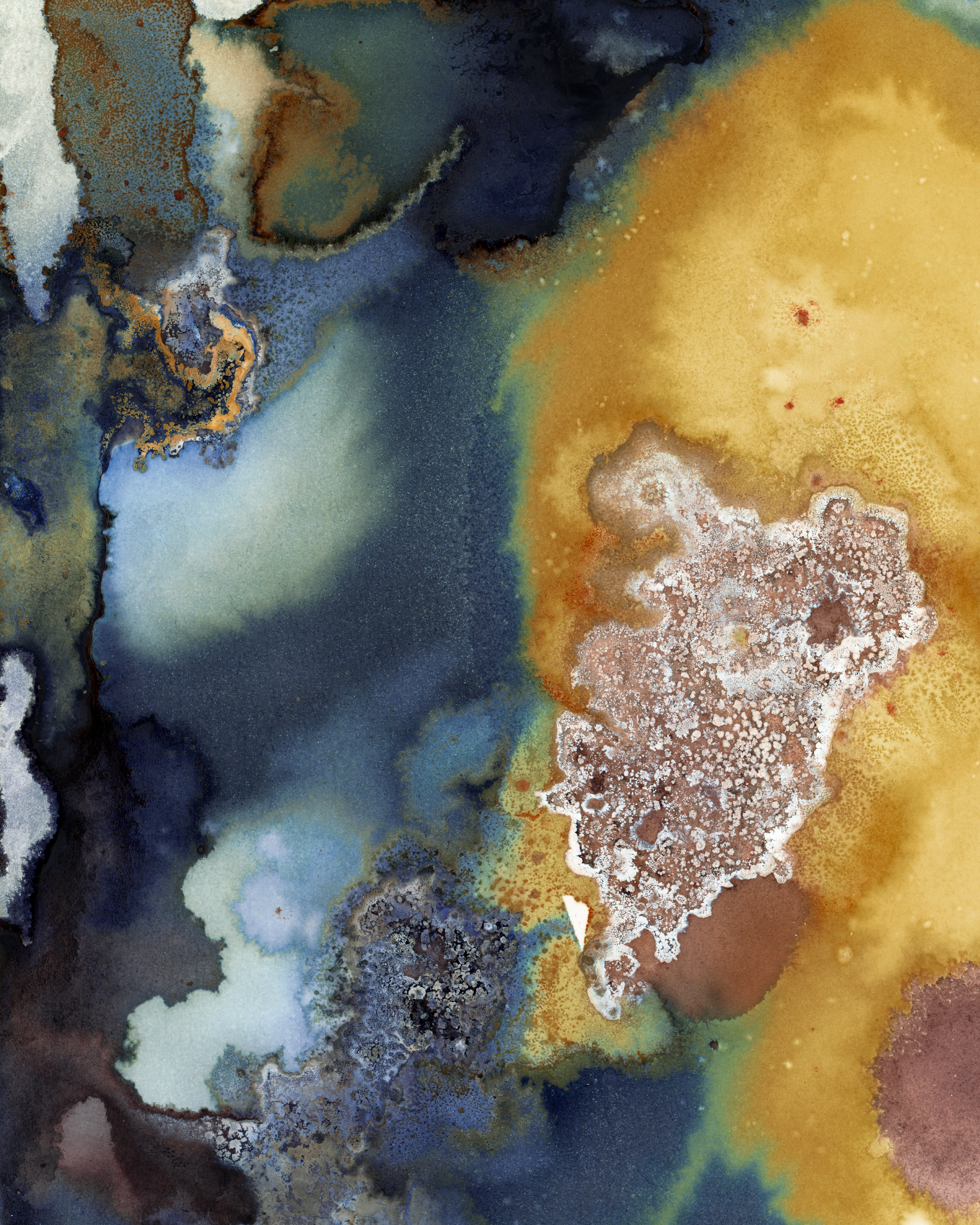 Chemical reactions between light-sensitive medium, minerals, natural pigments, rust and acids on paper. Scanned & digitally enhanced.