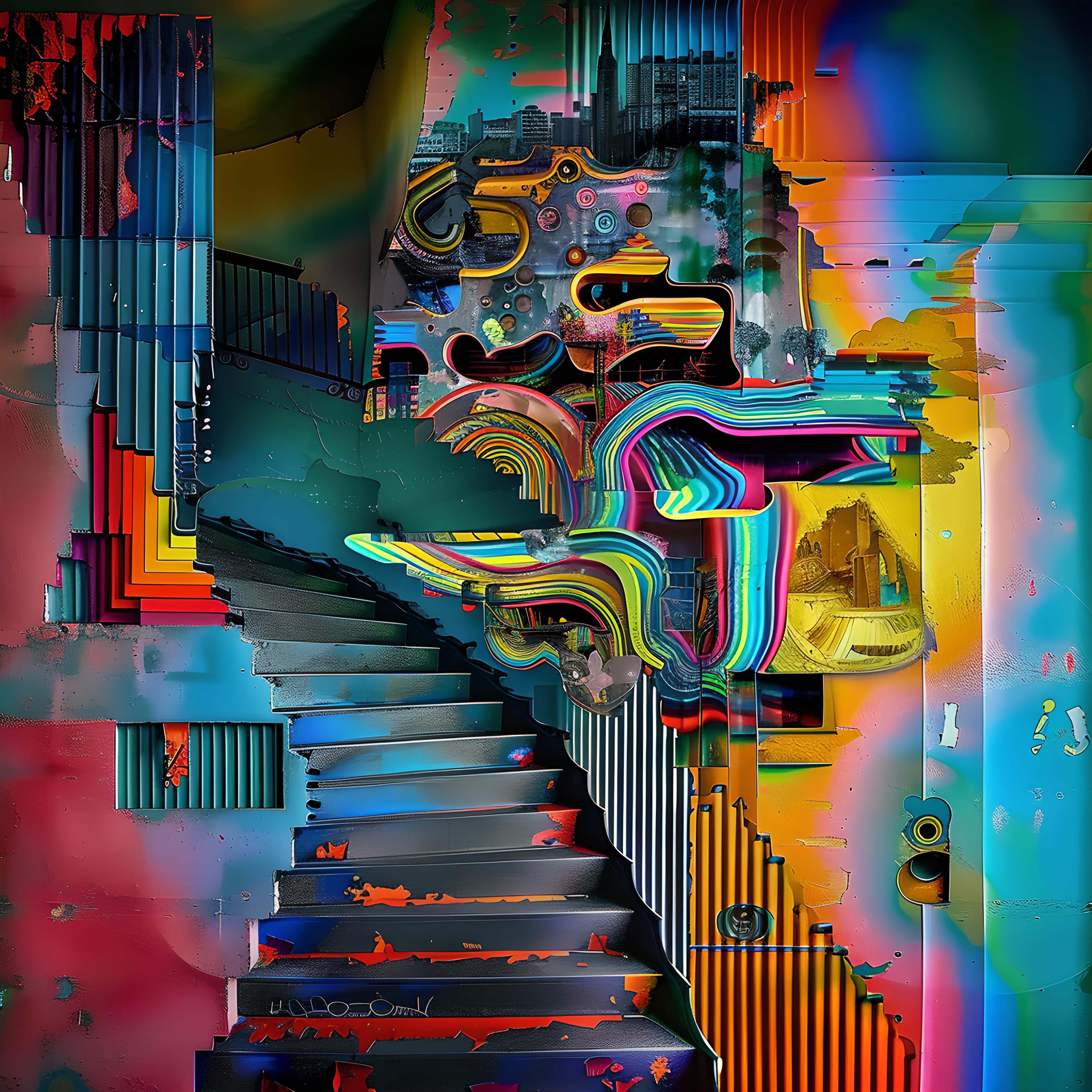 "New Options Appear" explores the sudden and often surreal arrival of unexpected opportunities, framed within a vibrant and distorted world of shifting perspectives. The piece is dominated by a chaotic yet mesmerizing composition of staircases, vivid color gradients, and abstract forms. The staircases twist and turn in impossible directions, symbolizing the uncertainty and excitement that come with new paths unfolding.